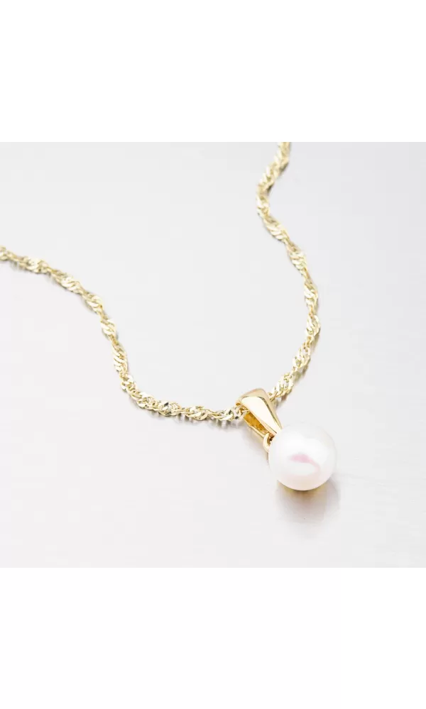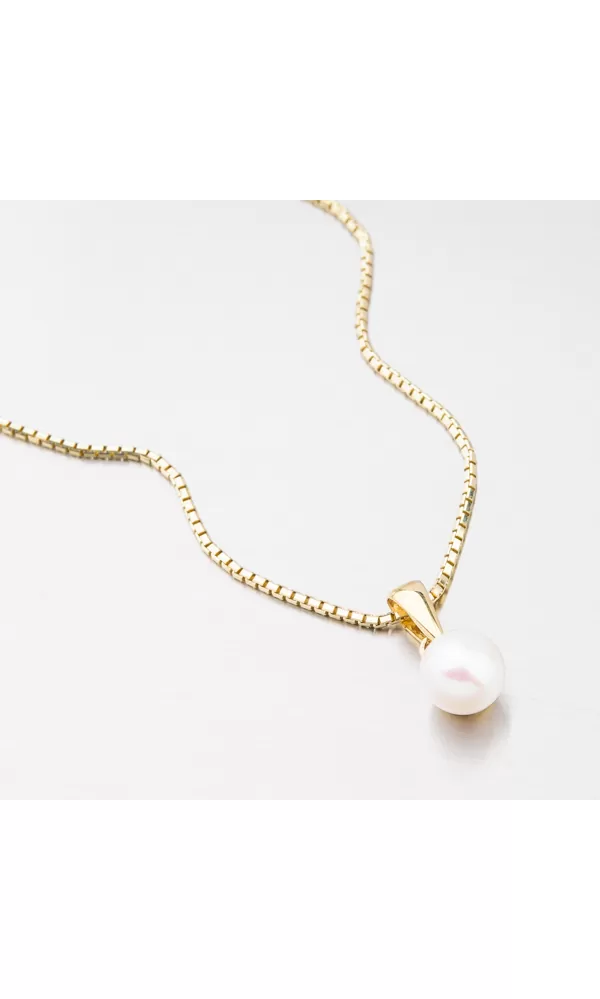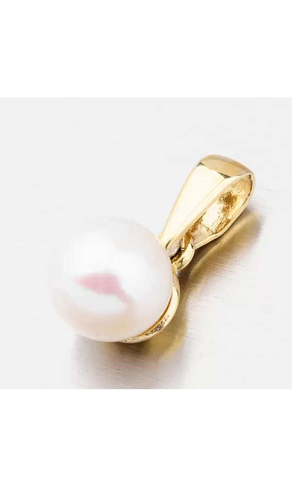 Veľmi atraktívny prívesok je zdobený veľkou sladkovodnou perlou v bielej farbe. Prívesok je vyrobený zo žltých štrnástich -karátových zlatých 585/1000 v lesklom povrchu.