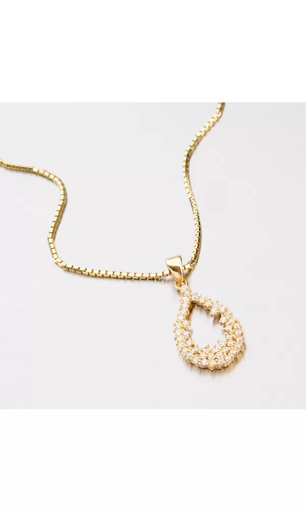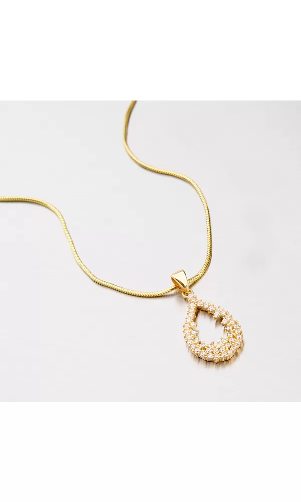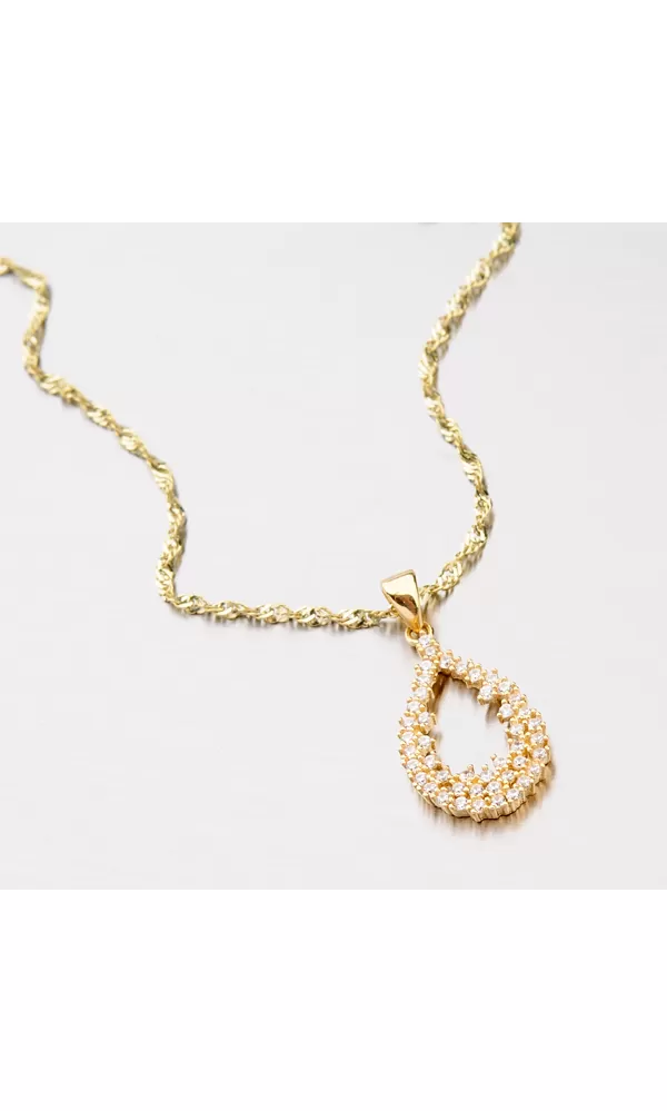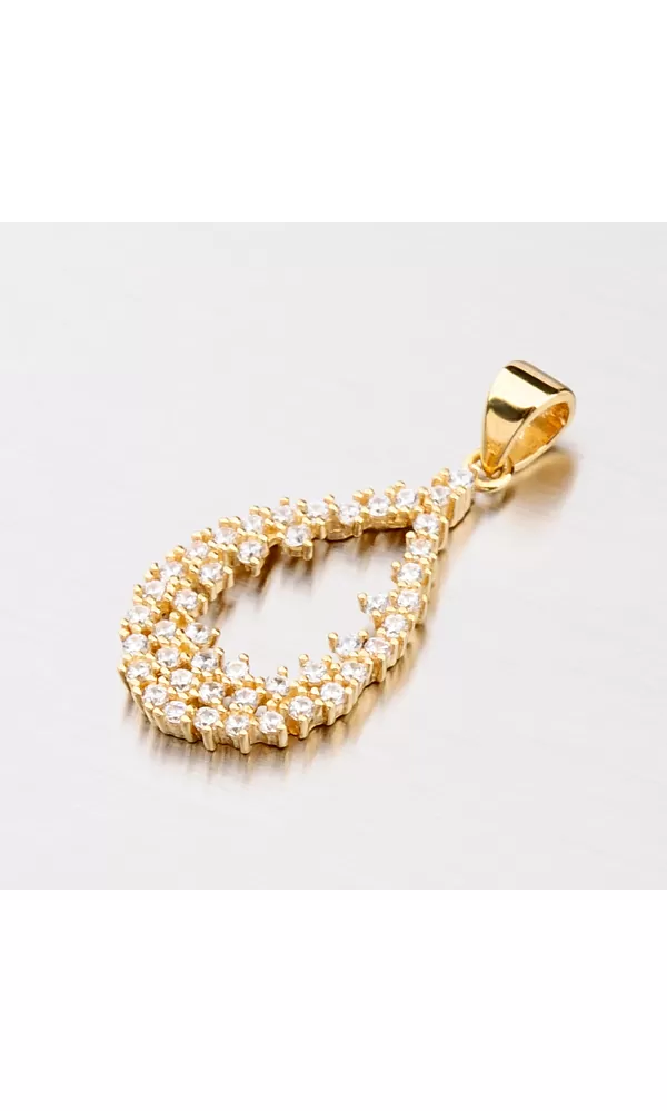 Elegantný žiarivý prívesok vyrobený zo žltého štrnástich karátového zlata o rýdzosti 585/1000 zaujme svojim osadením žiarivými zirkónmi. Zirkóny je osadená celá časť prívesku, ktorý je vyrobený do tvaru kvapky. Prívesok zažiari na každej akcii a pristane každej žene.