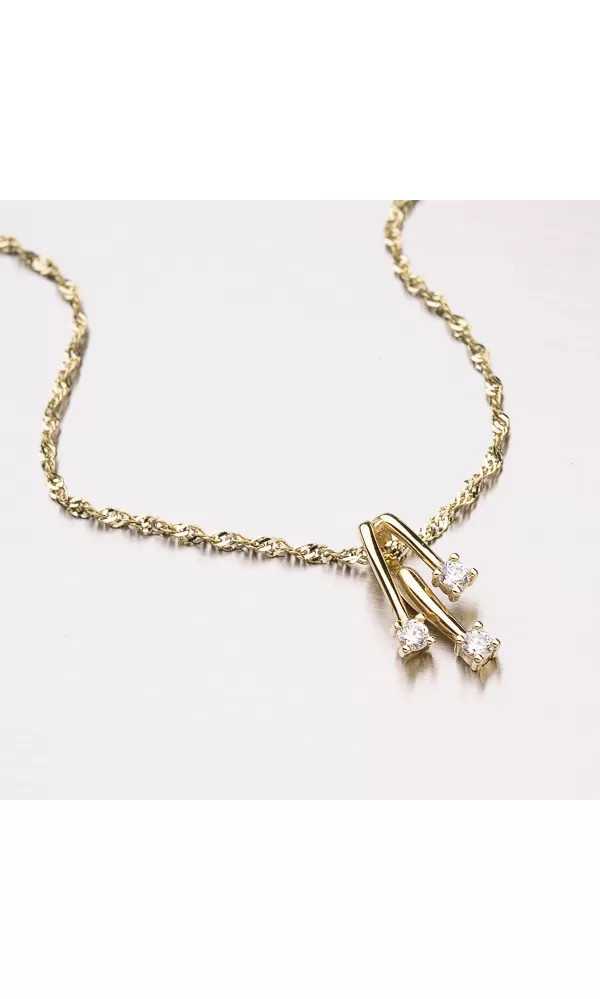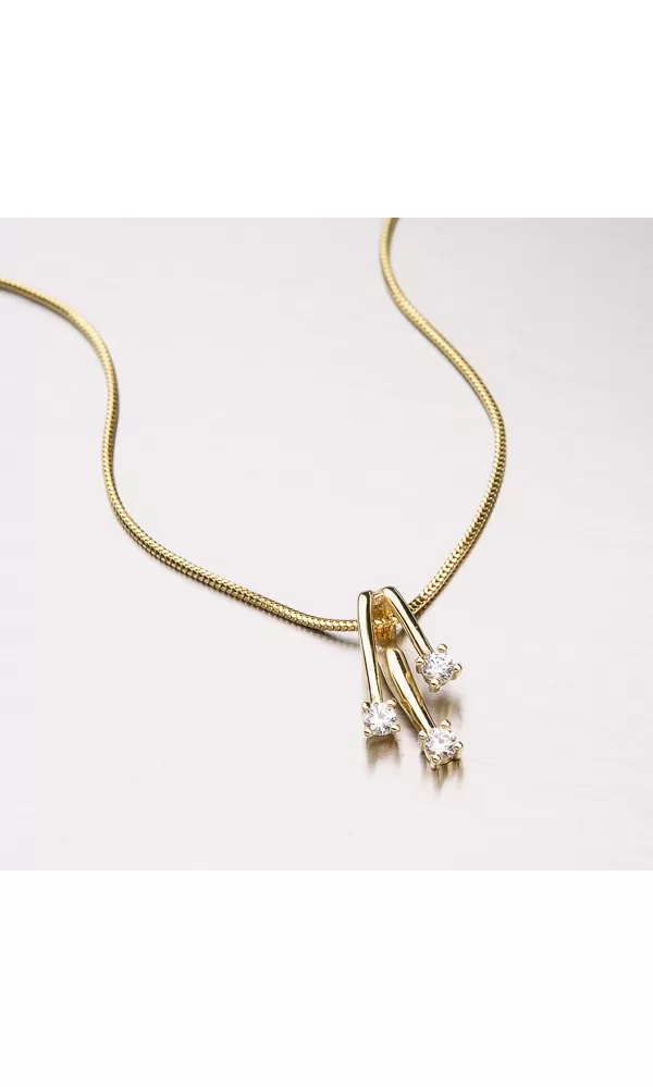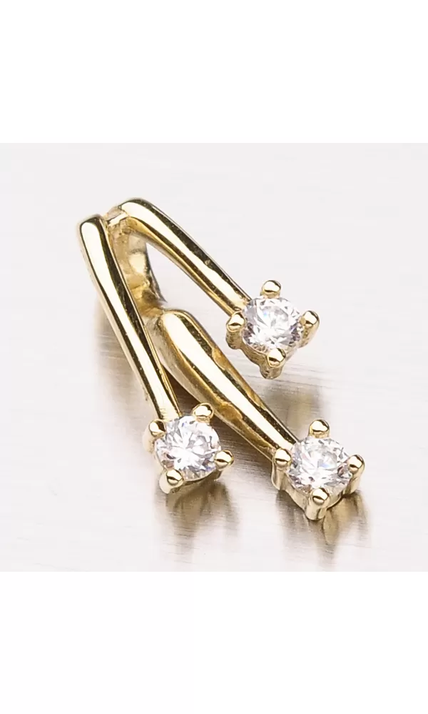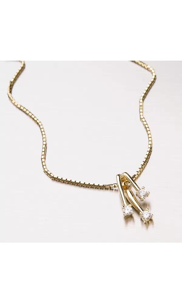Zaujímavý prívesok je vyrobený zo žltého štrnásťkarátového zlata 585/1000 v lesklej povrchovej úprave. Prívesok je zdobený troma blýskavými zirkónmi bielej farby. Prívesok nemá klasické očko ale retiazka ide cez prívesok. Prívesok tak dokonale splynie s vašim dekoltom.