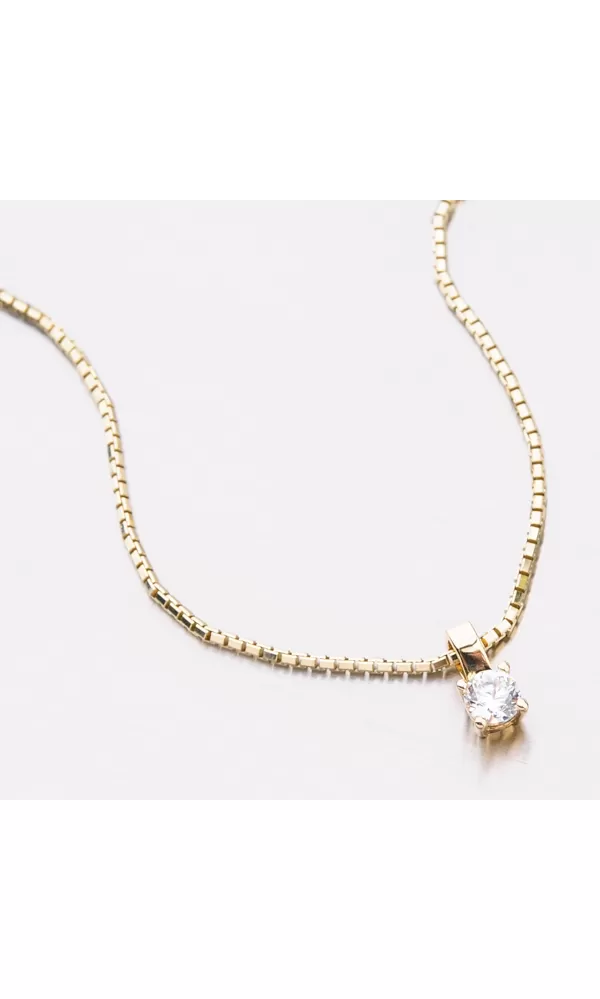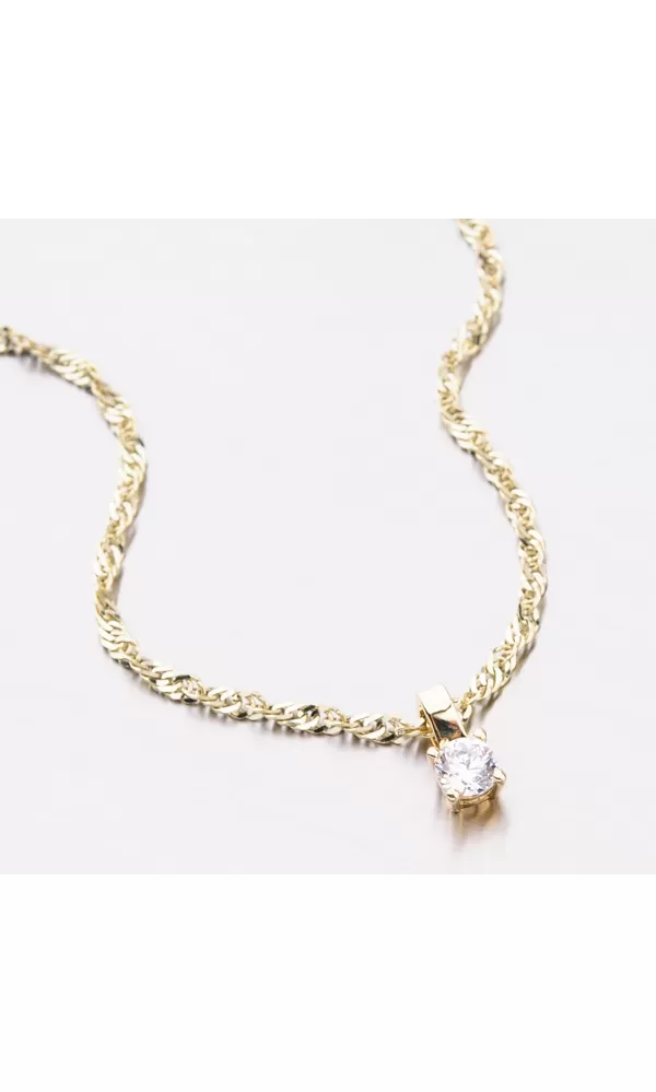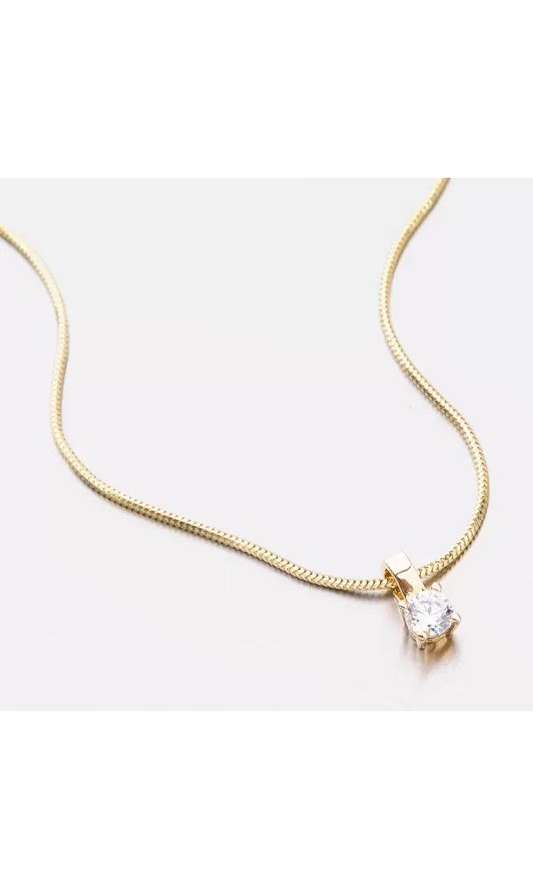 Hľadáte decentný šperk, ktorý vám ozdobí dekolt? Tento prívesok je leštený do vysokého lesku a zdobí ho zirkón v briliantovom bruse, ktorý je precízne vsadený do zlata a drží ho štyri krapne.