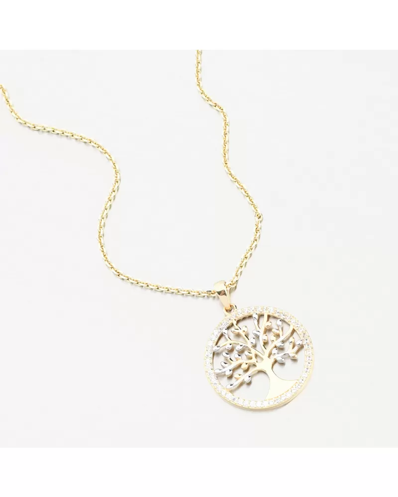 Skvelý nápad na darček, ktorý zaručene oslní svojím spracovaním. Na prívesku je obľúbený motív stromu života, ktorý predstavuje spojenie s rodinou a predkami, či plodnosť, rast a silu. Strom života je po celom obvode posiaty zirkónmi. Zirkóny sú briliantovo vybrúsené, čo zaisťuje maximálnu brilanciu brúsených faziet, dokonale odráža svetlo a neuveriteľne sa leskne z každého pohľadu. Jednotlivé listy na stromčeku sú navyše v žltom a bielom zlate.