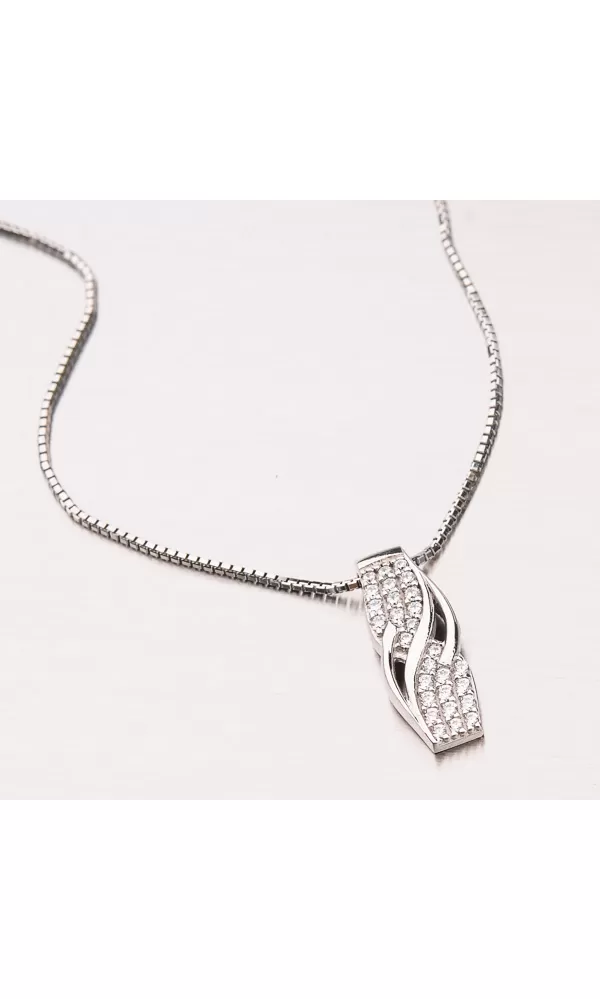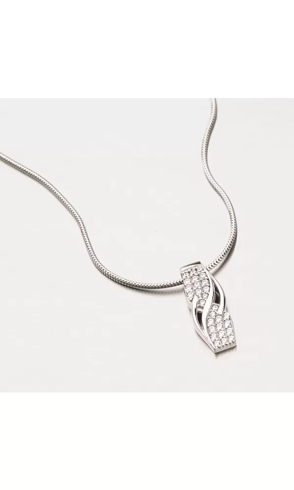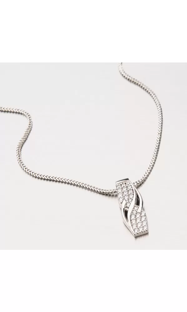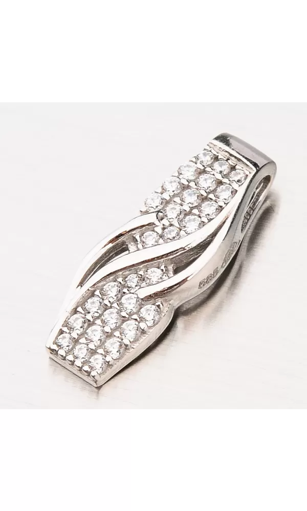 Hľadáte originálny šperk čo vám rozžiari dekolt? Tento veľmi elegantný prívesok je tá správna voľba. Jeho originálny dizajn a zaujímavé riešenie vás upúta. Nemá klasické očko na retiazku. Retiazka prejde zadnou stranou, kde je prierez priamo v prívesku. Zlatý prívesok zdobia zirkóny v briliantovom bruse s dokonalou brilanciou. Prívesok je vyrobený z bieleho štrnásťkarátového zlata 585/1000 v lesklej povrchovej úprave.