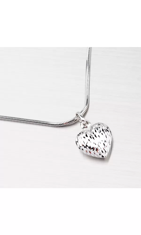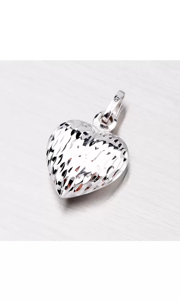 Elegantný prívesok v tvare srdca je vyrobený z bieleho štrnásťkarátového zlata 585/1000 v lesklej povrchovej úprave. Prívesok je zdobený jemným gravírovaním. K tomuto prívesku je možné použiť retiazku o max. priemere 1,75 mm.