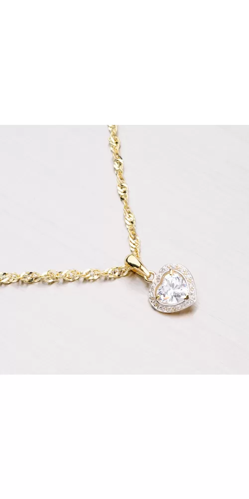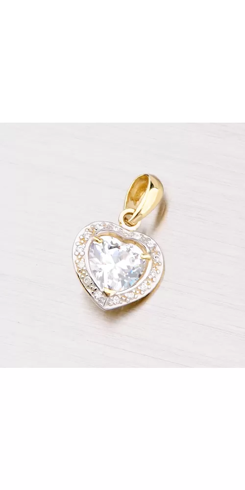 Elegantný prívesok v tvare srdca posadený po svojom obvode drobnými bielymi zirkónmi as uprostred zasadeným jedným väčším bielym zirkónom je vyrobený zo žltého štrnástich karátového zlata 585/1000. Zlatý prívesok je vyrobený v lesklej povrchovej úprave.
