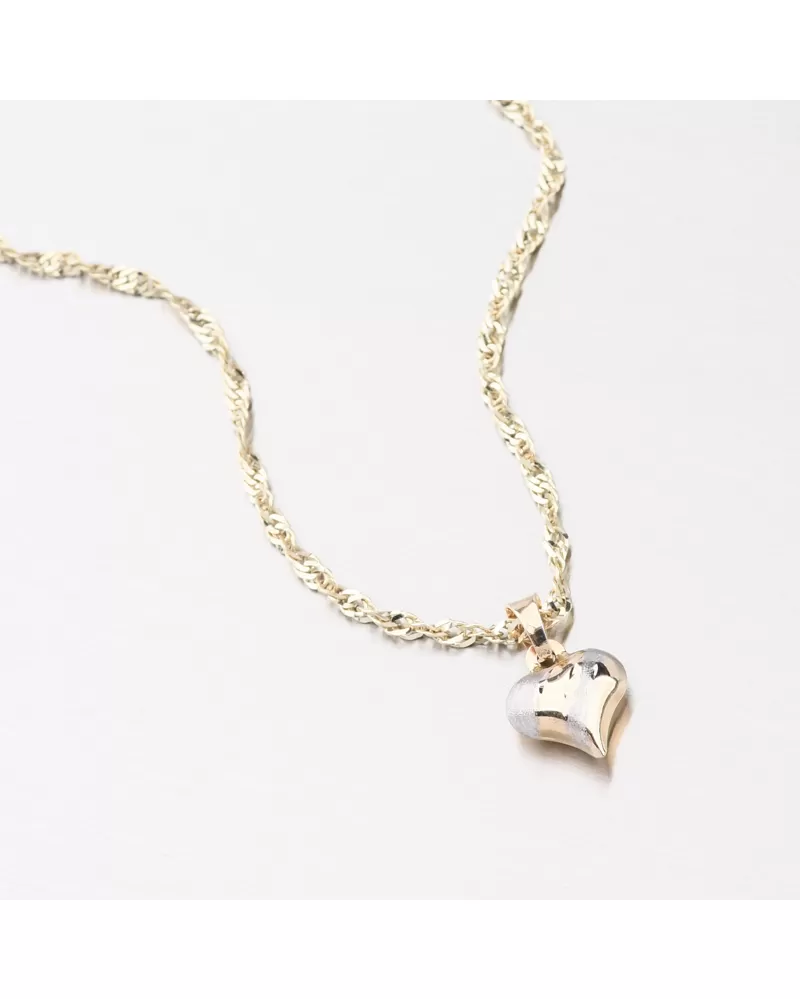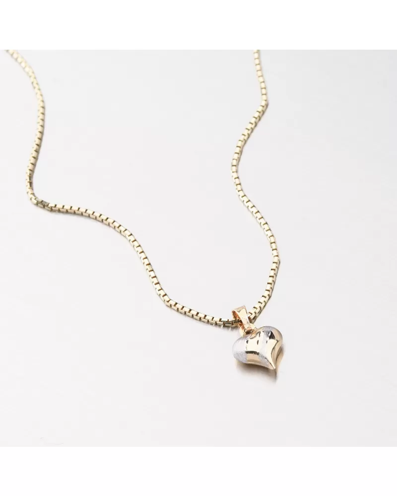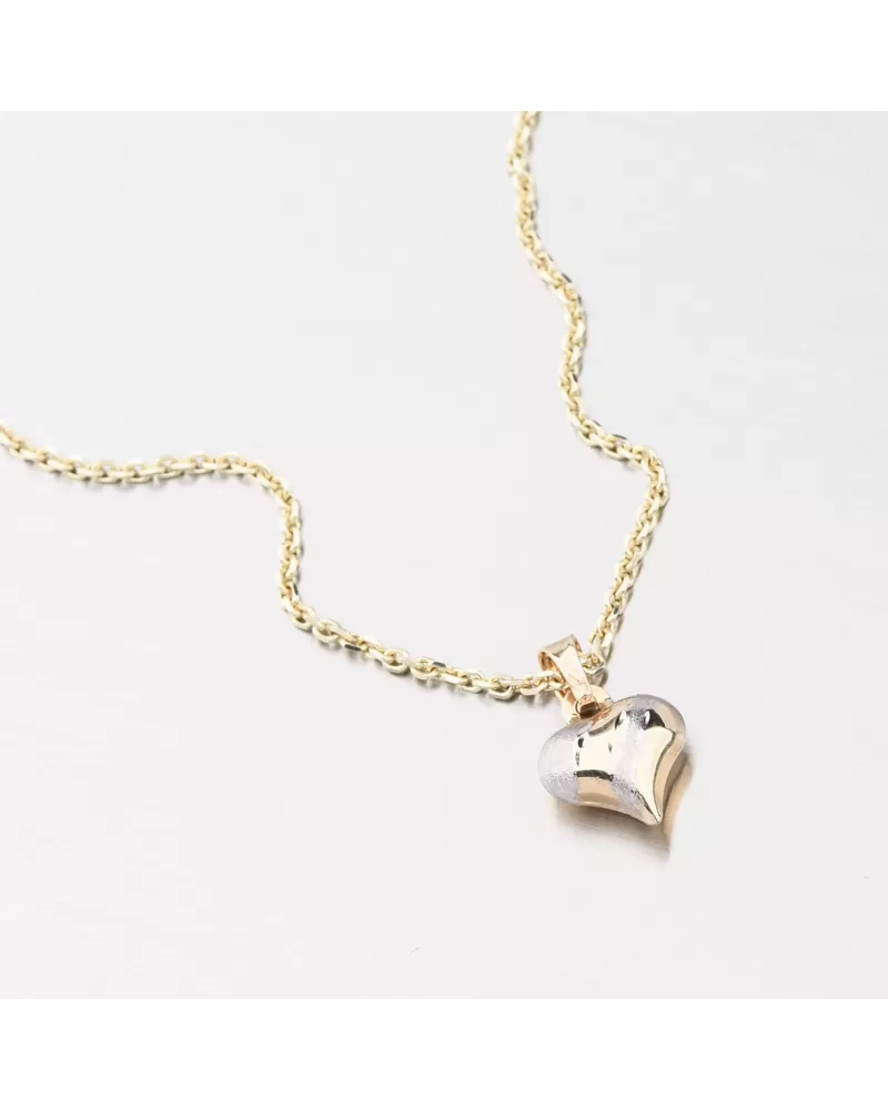 Jemný zlatý prívesok v tvare srdca poteší každú romantickú dušu. Urobte svoju drahú polovicu s týmto šperkom. Prívesok je dutý a je zdobený leskom a zamatovou rohožou. Na jednej strane striedajú bielu farbu zlata vo zamatovej podložke so žltou farbou zlata a v lesku. Prechody medzi farbami sú zdobené výrazným gravírovaním alebo tvárami. Aspekty vyrobené diamantovým nástrojom, ktorý poskytuje výsledným aspektom maximálny lesk, ktorý dokonale odráža svetlo a má krásnu brilanciu zo všetkých uhlov. Druhá strana srdca je v žltej a lesk, takže ho môžete nosiť na oboch stranách podľa nálady.