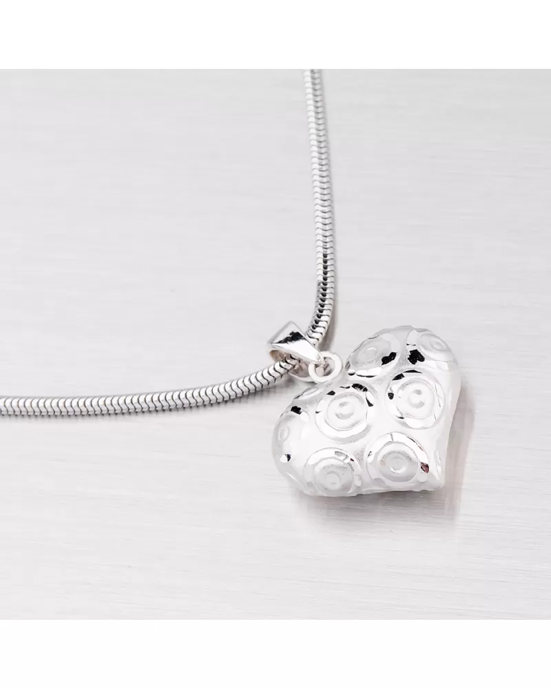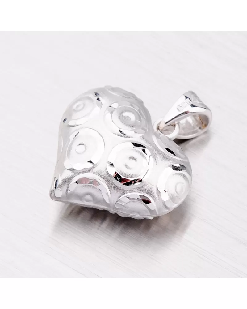 Jemný elegantný prívesok z bieleho štrnásťkarátového zlata 585/1000 je vyrobený v kombinácii lesklej a matnej povrchovej úpravy. Prívesok je vyrobený v tvare srdiečka a je zdobený jemným gravírovaním. K prívesku je vhodné použiť retiazku o max. priemere 2,75 mm.