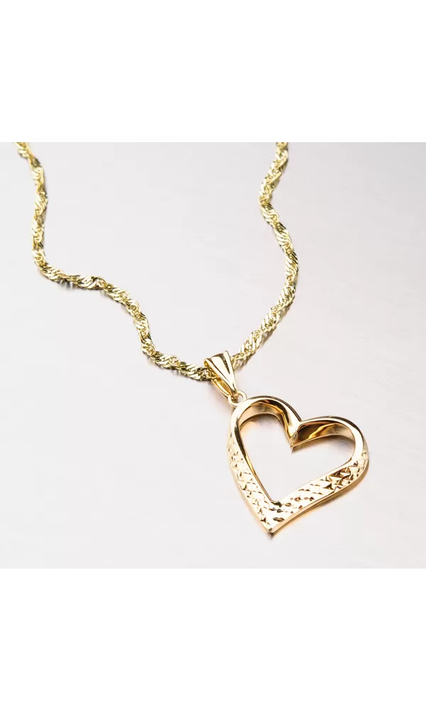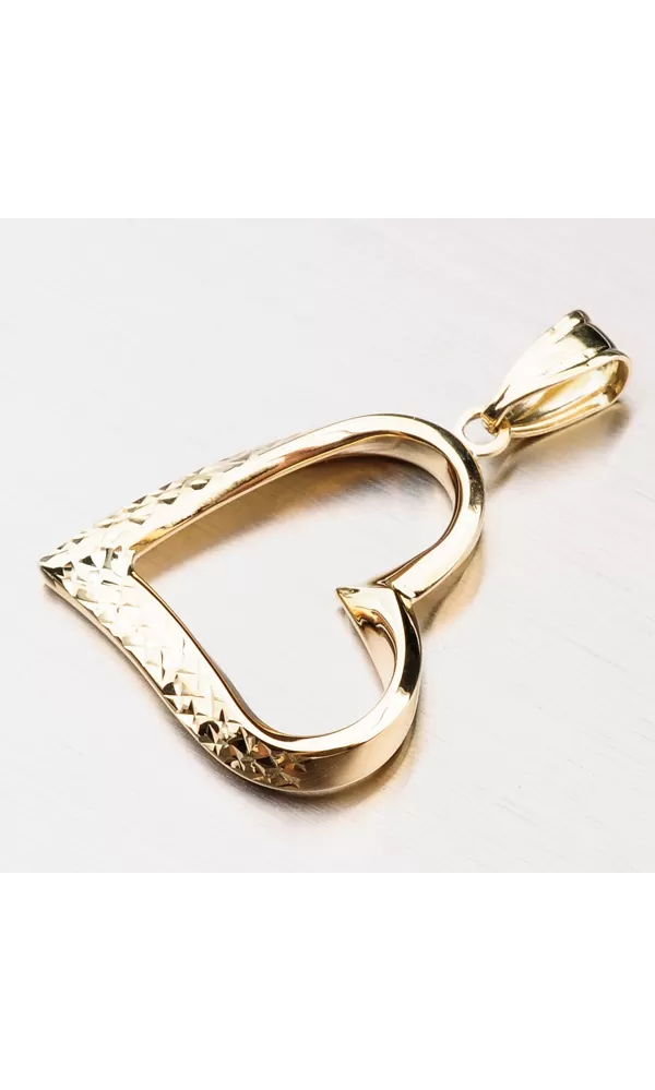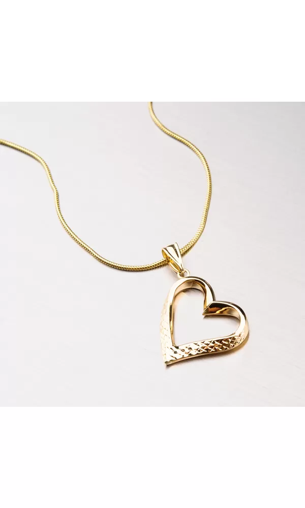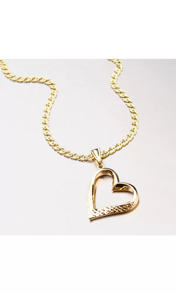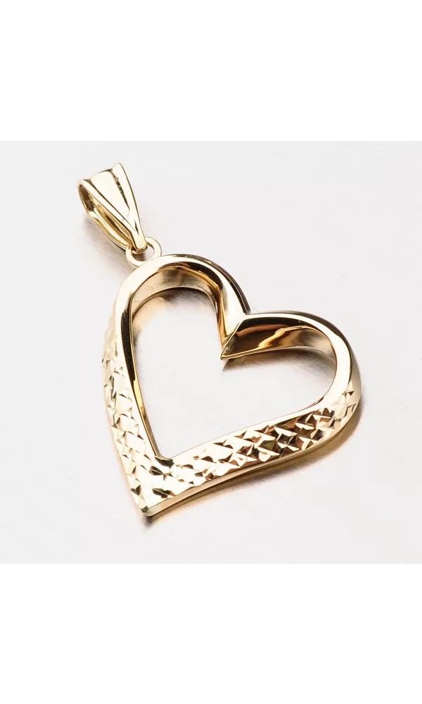 Veľký prívesok v tvare srdca je vyrobený zo žltého štrnásť karátového zlata rýdzosti 585/1000 s lesklou povrchovou úpravou. Zlaté srdiečko je zdobené gravírovaním, ktoré svojimi odleskami nahradí akýkoľvek kameň. Môžete darovať srdce alebo potešiť seba snom. Je to šperk, ktorý sa hodí ku všetkému.