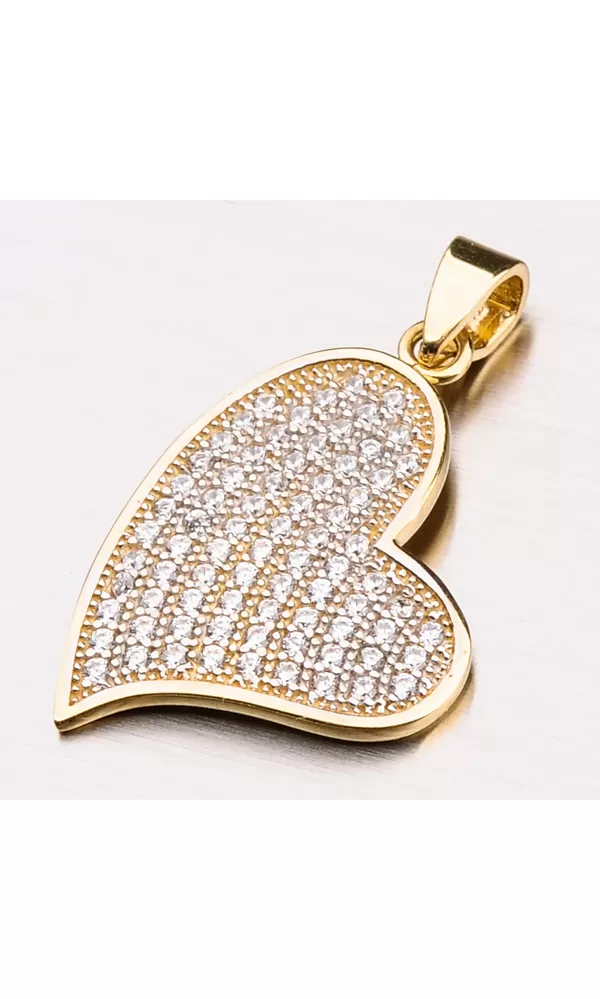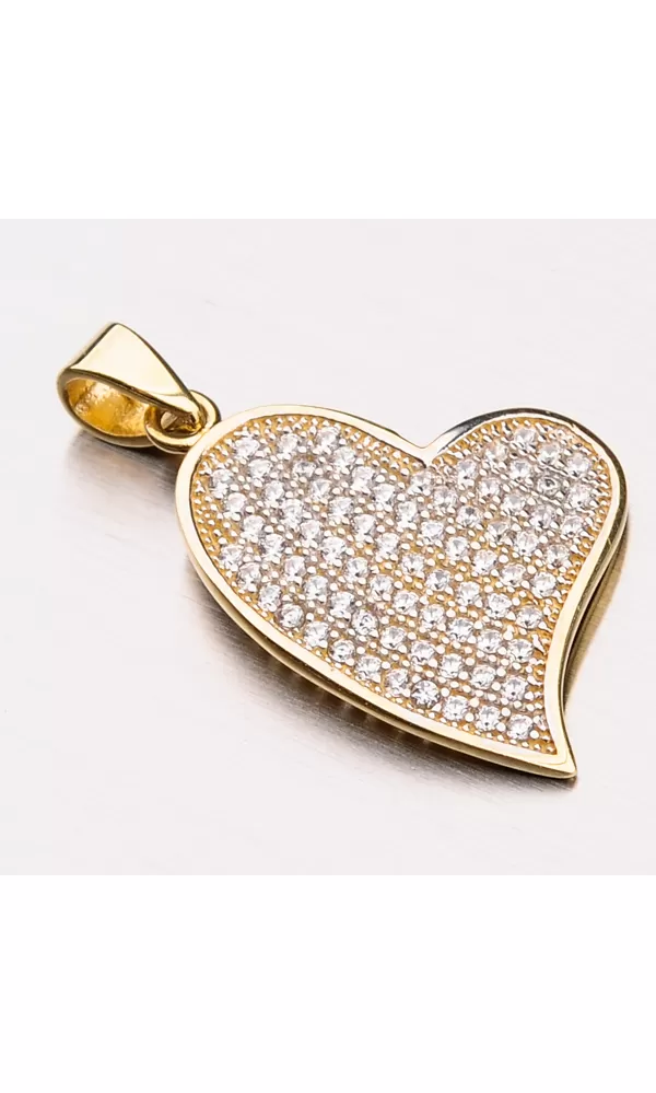 Hľadáte romantický darček pre svoju milú? Úspech budete mať s týmto nádherným príveskom v tvare srdca. Krásny prívesok je vyrobený zo žltého zlata o rýdzosti 585/1000 v lesklej povrchovej úprave. Prívesok je celý vysadený trblietavými zirkónmi v briliantovom bruse. K tomuto prívesku je vhodná retiazka o šírke 1,50 mm.