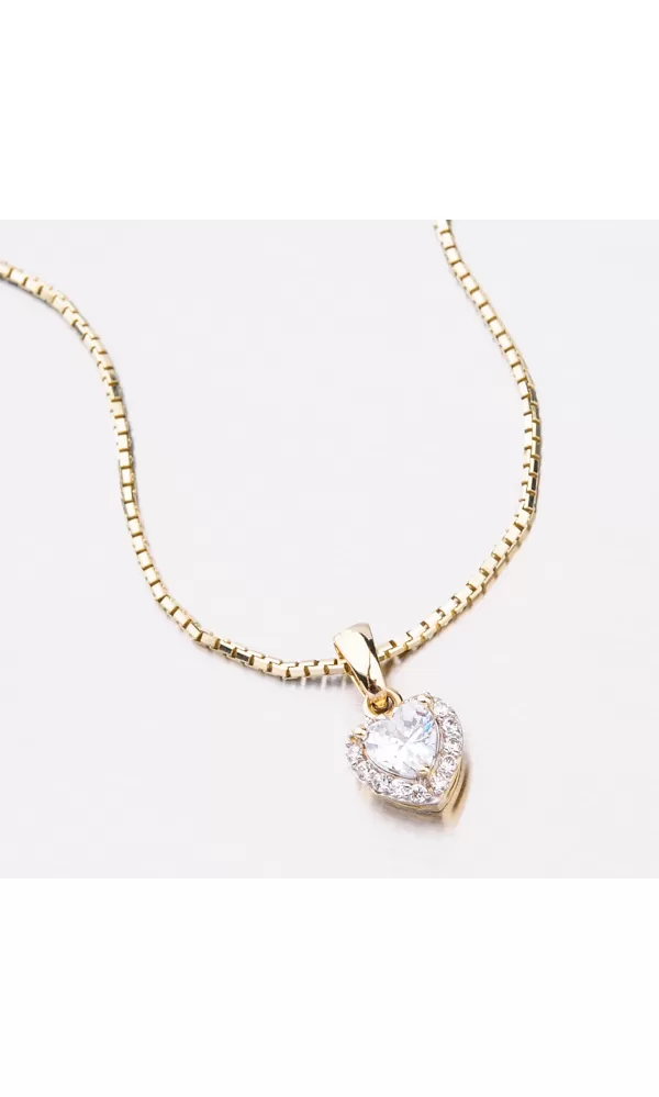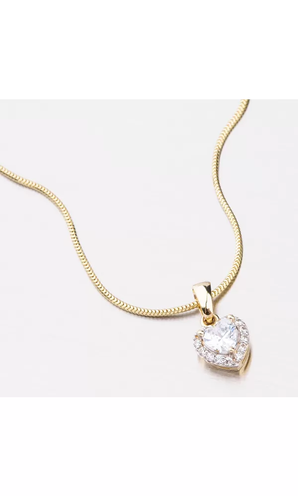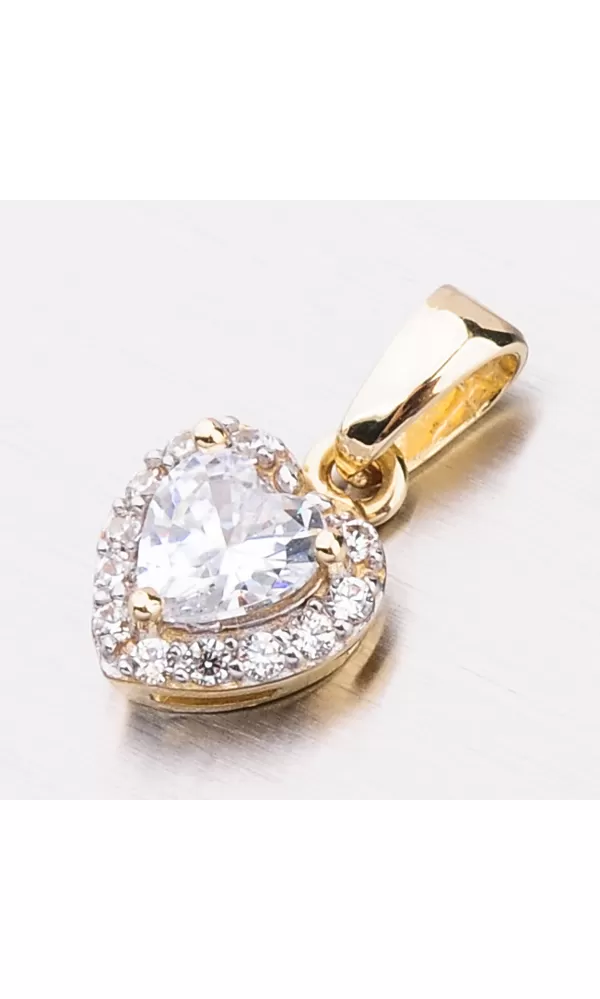Zlatý prívesok v romantickom dizajne uchváti každú ženu. Prívesok je v tvare srdca a nádherne sa leskne vďaka zirkónom, ktoré prívesok zdobia. Urostred prívesku je vsadený veľký zirkón brúsený do tvaru srdca a uchytený je tromi krapnami. Okolo veľkého zirkónu sú vsadené zirkóny v briliantovom bruse. Tento brús zaisťuje zirkónom brilanciu pravých diamantov.
