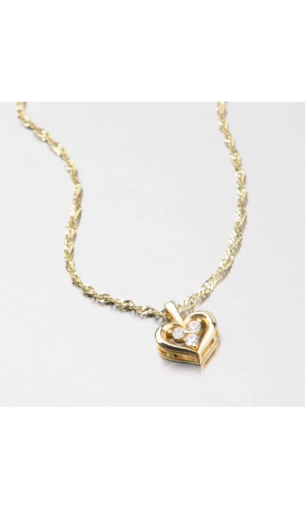 Srdiečko s tromi bielymi zirkónmi je vyrobené zo žltého štrnástich karátového zlata 585/1000 v lesklej povrchovej úprave.