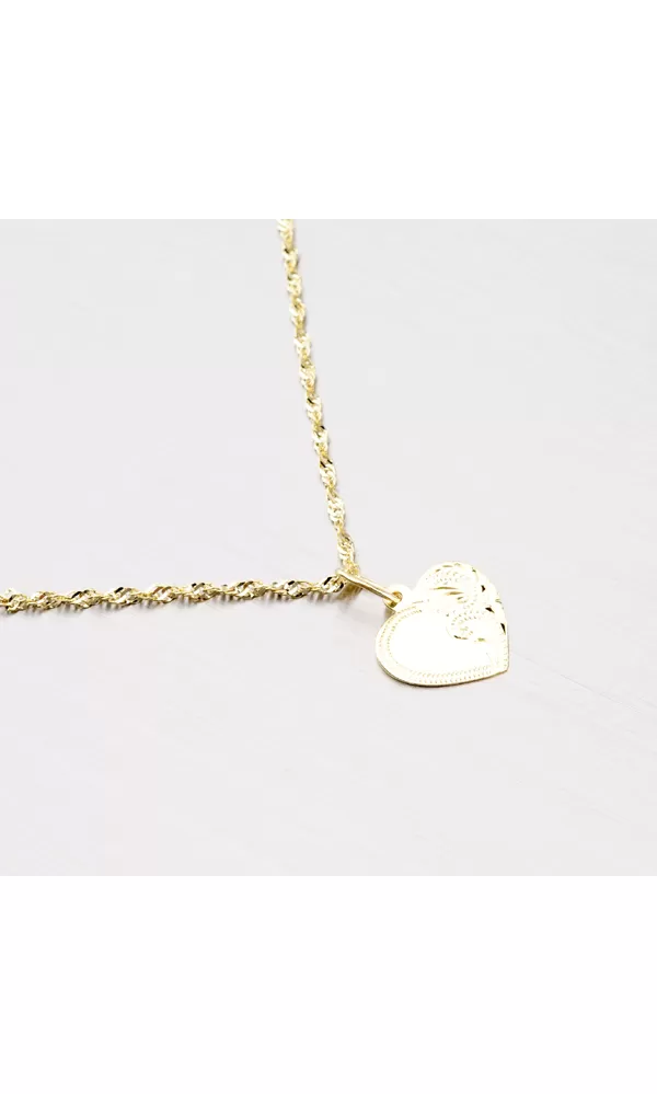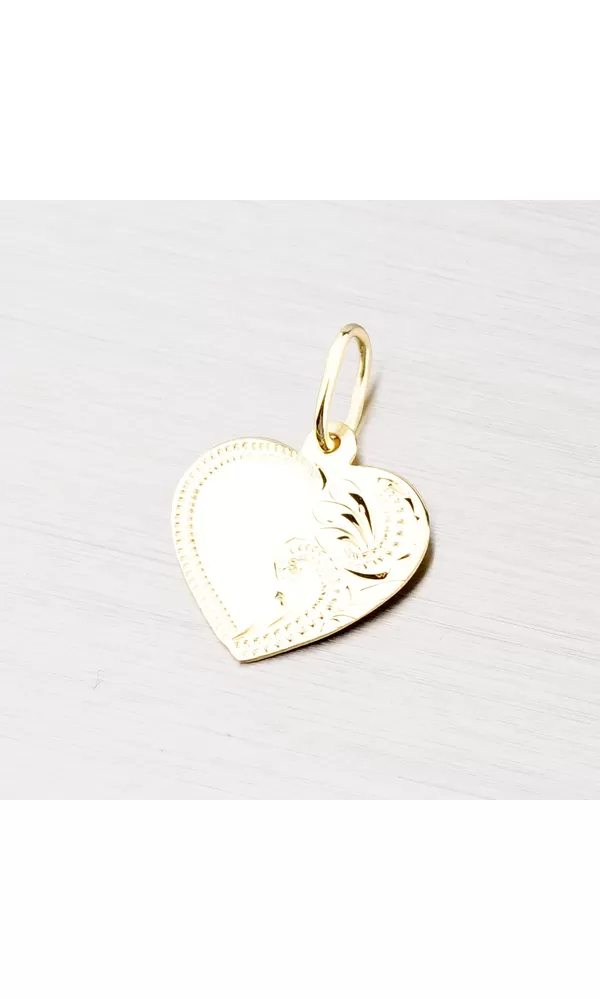 Prívesok v tvare srdca zdobený ručným gravírovaním je vyrobený zo žltého štrnásťkarátového zlata 585/1000 v lesklej povrchovej úprave. Pri tomto prívesku je na prvý pohľad zrejmé dokonalé spracovanie do najmenších detailov.