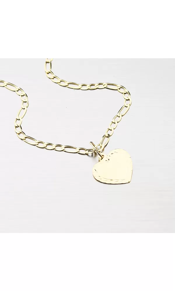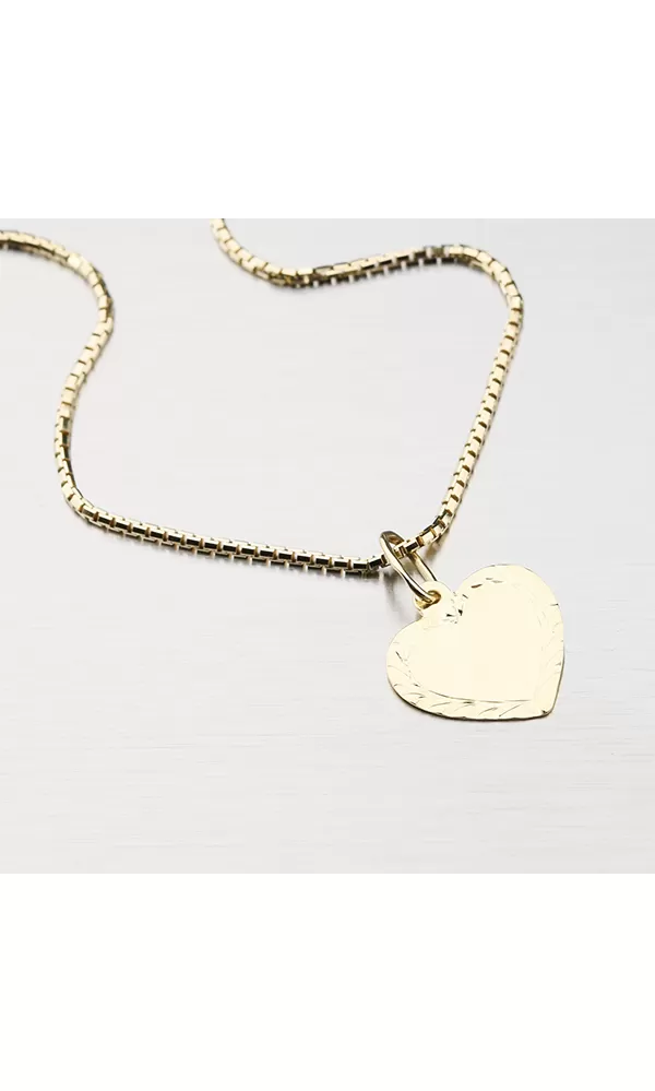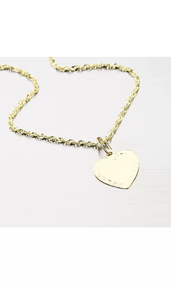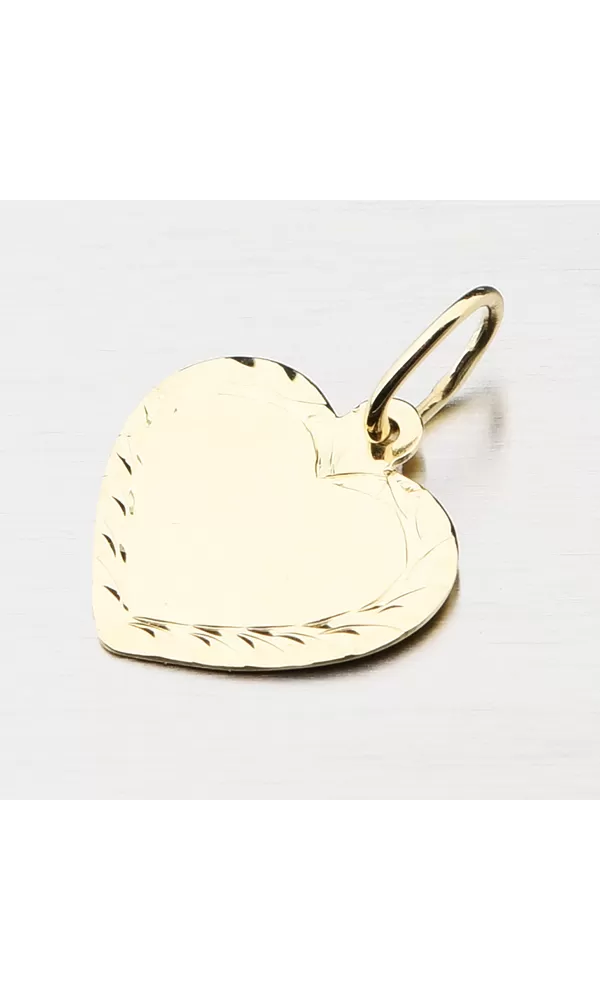 Srdcový prívesok zdobený ručným gravírovaním je vyrobený zo žltých štrnástich -karátových zlatých 585/1000 v lesklom povrchu. Na prvý pohľad tento prívesok vykazuje dokonalé spracovanie do najmenších detailov.