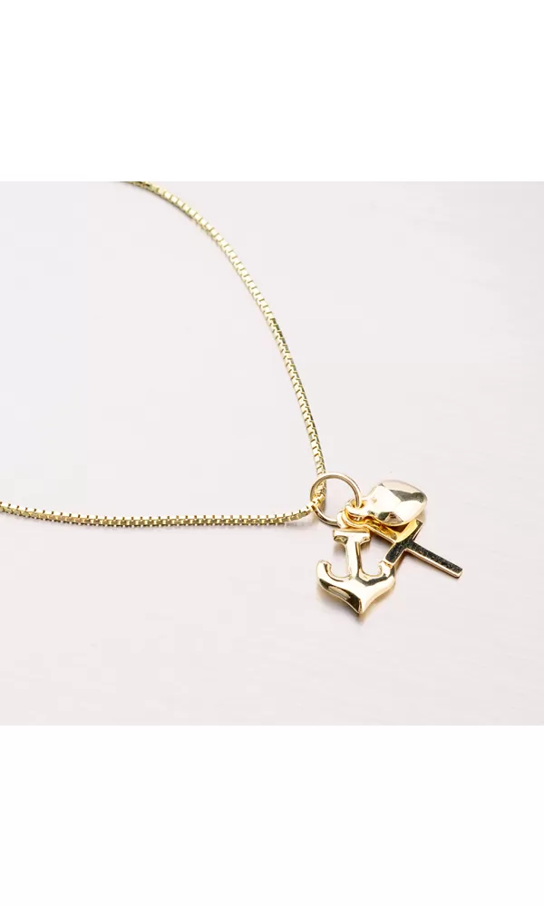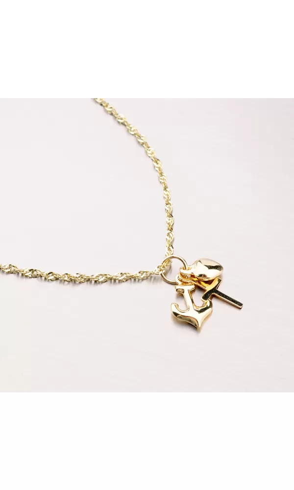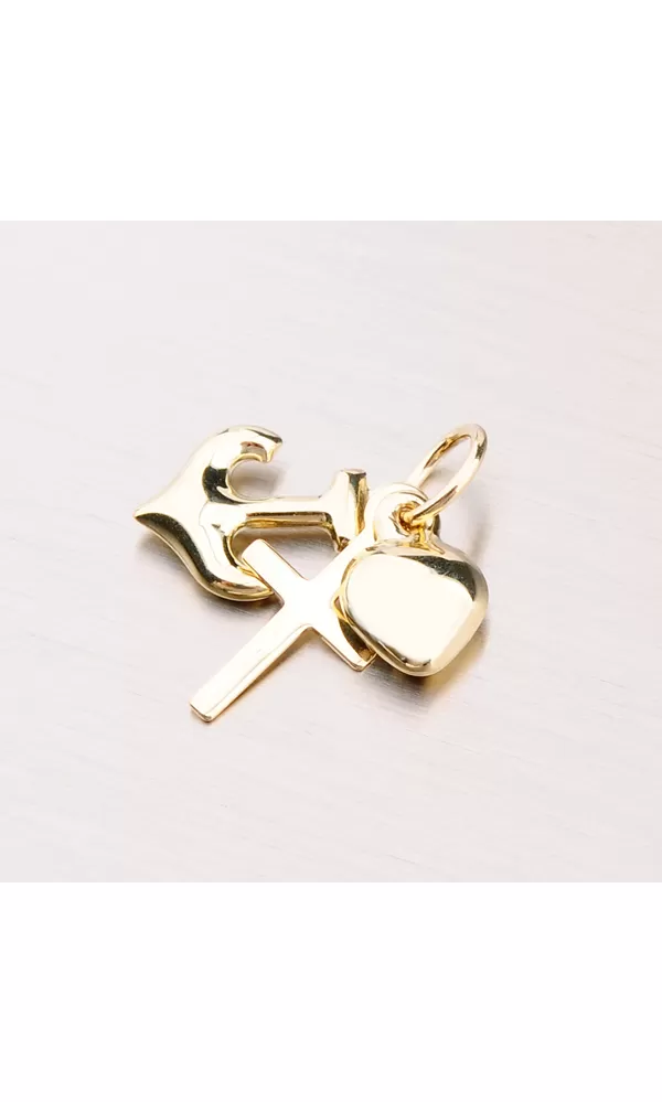 Zlatý prívesok, ktorý môžete darovať komukoľvek. Prívesok tvoria tri časti. Srdce, kríž a kotva. Každý príves má svoj zmysel a je to šťastie, viera a nádej. Prívesok je leštený do vysokého lesku.