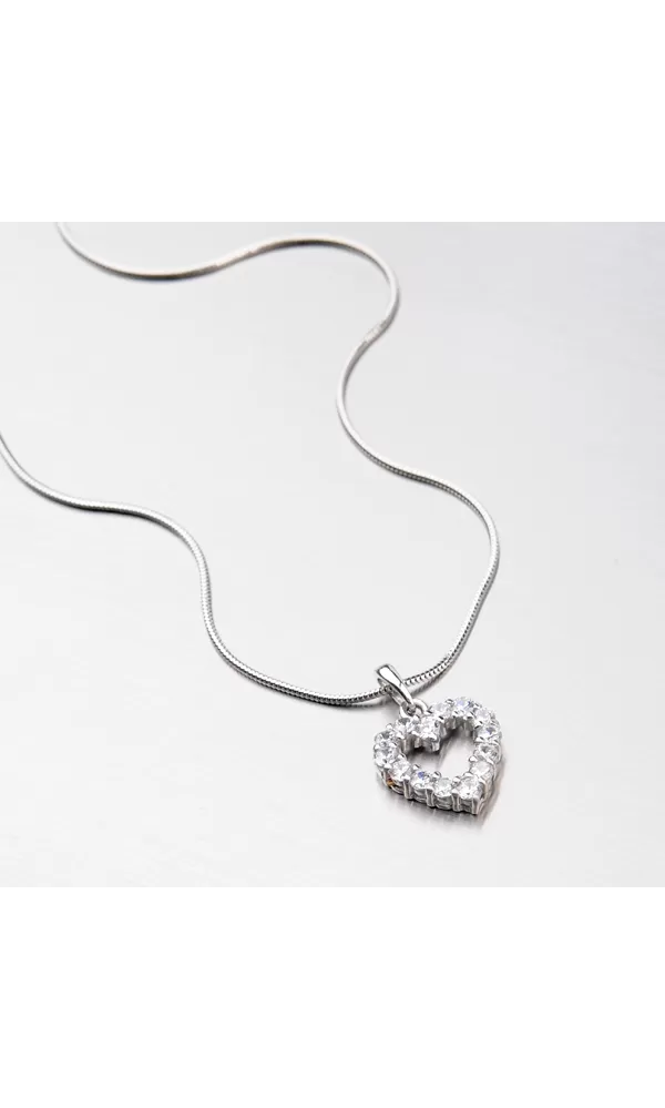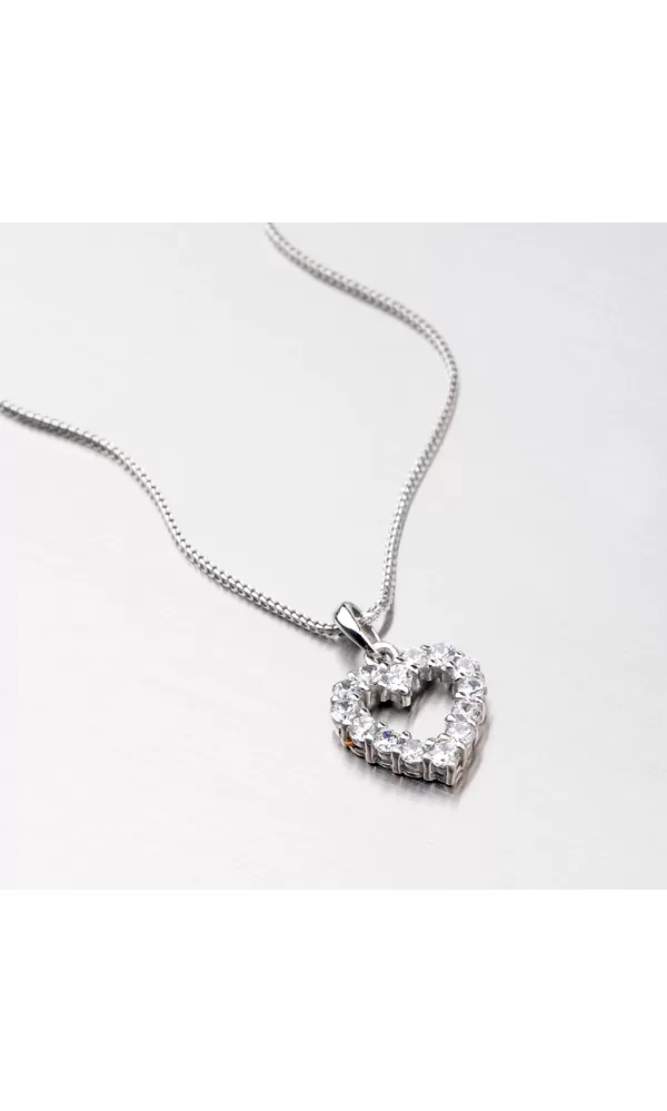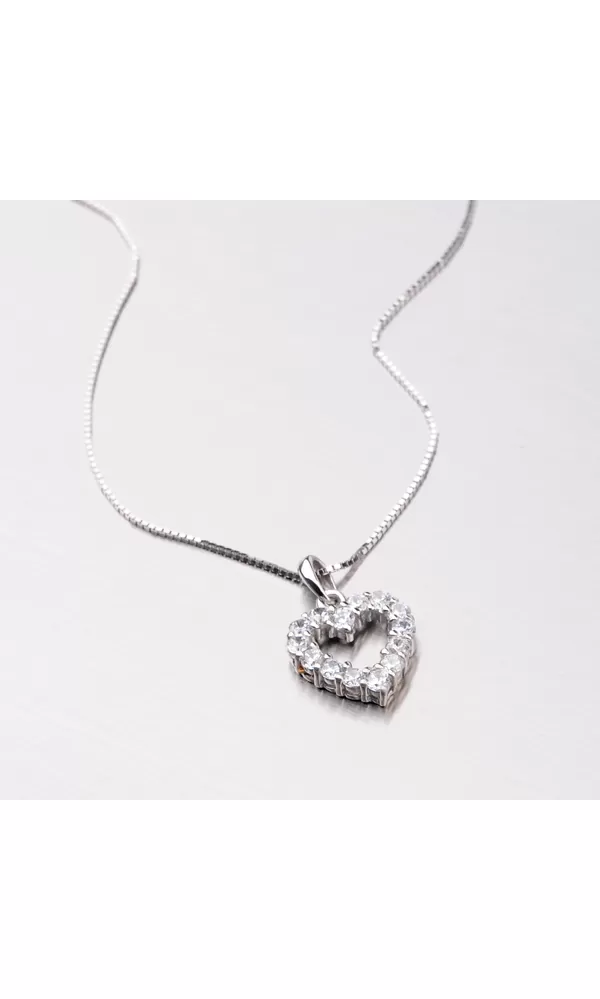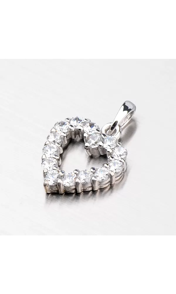 Romantický prívesok v tvare srdiečka vyrobený zo štrnástich karátového bieleho zlata o rýdzosti 585/1000 urobí radosť každej slečne. Prívesok má lesklý povrch a je osadený štrnástimi žiarivými zirkónmi v bielej farbe.