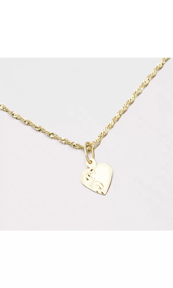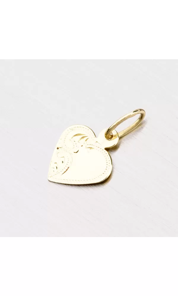 Jemný prívesok v tvare srdiečka zaručene poteší Vašich milovaných! Prívesok je vyrobený zo žltého štrnásťkarátového zlata 585/1000. Zlaté srdiečko je v lesklej povrchovej úprave zdobené ručným rytím. Tento prívesok je možný aj s rytinou, ktorú môžete dať, ako na prednú, tak aj na zadnú stranu prívesku. Vyryť môžete nechať Vami vybraný text ako je napr. monogram, iniciály, venovanie. Opis rytiny prosím uveďte v kolónke špeciálne požiadavky.