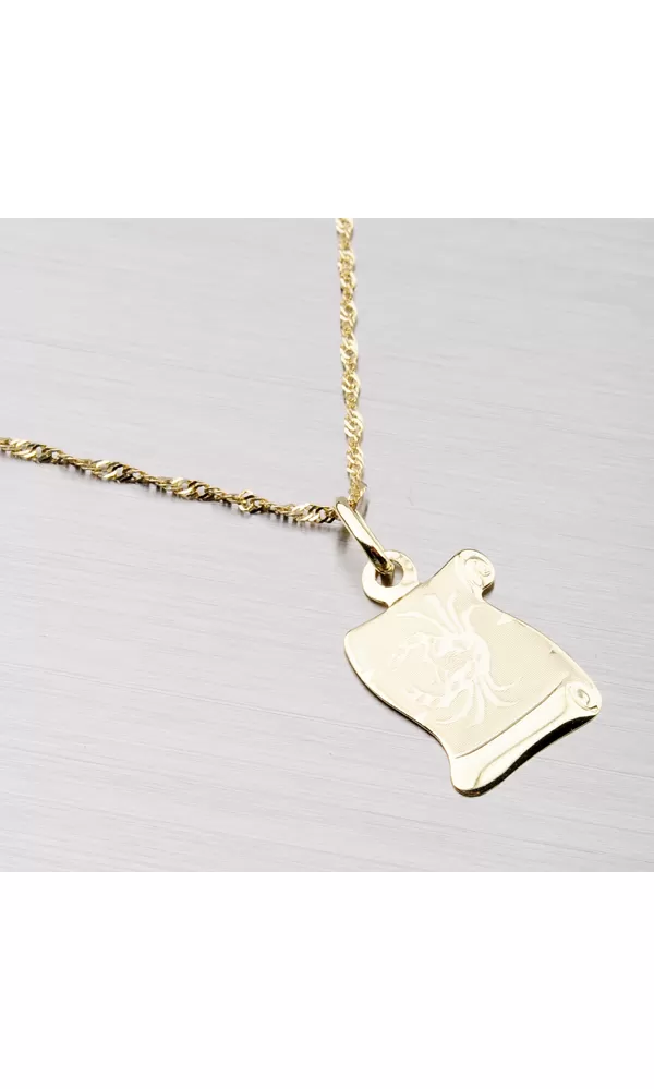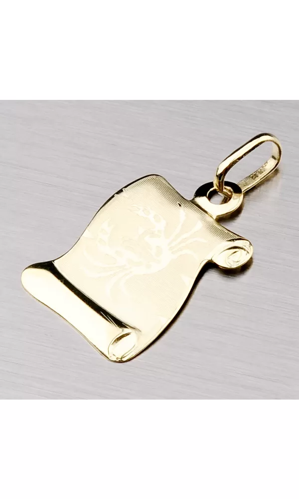 Prívesok v tvare pergamenu so znamením Rak zo žltého štrnásťtikarátového zlata - 585/1000 v kombinácii lesklej a matnej povrchovej úpravy.