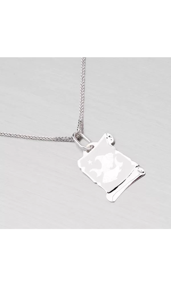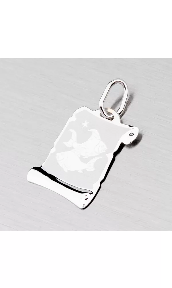 Prívesok v tvare pergamenu s hviezdnym znamením - Ryby je vyrobený z bieleho štrnásťkarátového zlata - 585/1000 v kombinácii lesklej a matnej povrchovej úpravy. Tento prívesok je možné doplniť rytinou na zadnej strane podľa vášho výberu. K tomuto prívesku je možné použiť retiazku o max. priemere 2,00 mm