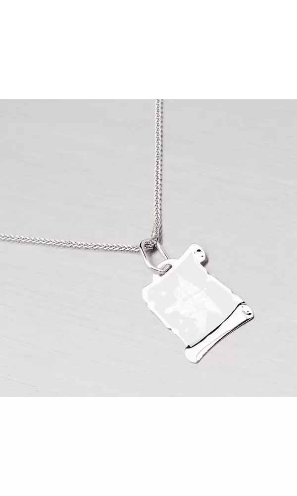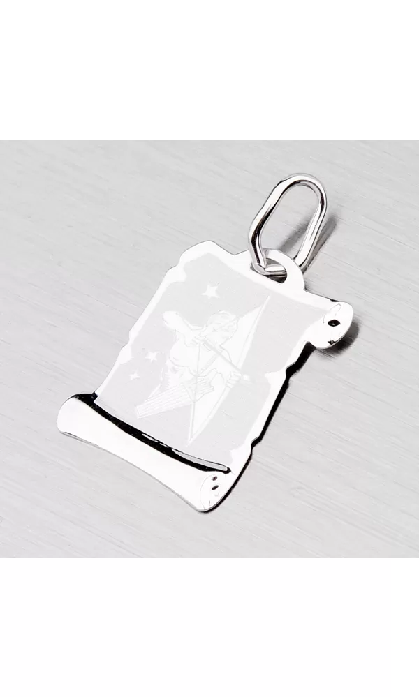 Prívesok v tvare pergamenu s hviezdnym znamením - Strelec je vyrobený z bieleho štrnásťkarátového zlata - 585/1000 v kombinácii lesklej a matnej povrchovej úpravy. Tento prívesok je možné doplniť rytinou na zadnej strane podľa vášho výberu. K tomuto prívesku je možné použiť retiazku o max. priemere 2,00 mm