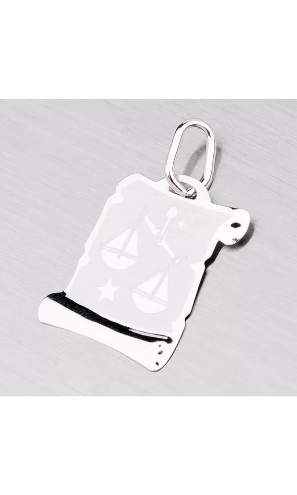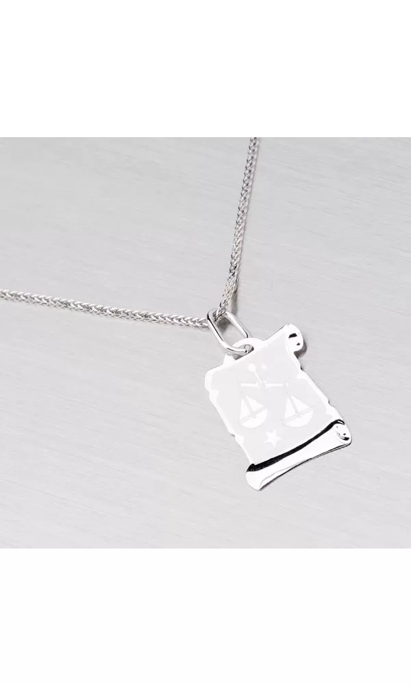 Prívesok v tvare pergamenu s hviezdnym znamením - Váhy je vyrobený z bieleho štrnásťkarátového zlata - 585/1000 v kombinácii lesklej a matnej povrchovej úpravy. Tento prívesok je možné doplniť rytinou na zadnej strane podľa vášho výberu. K tomuto prívesku je možné použiť retiazku o max. priemere 2,00 mm