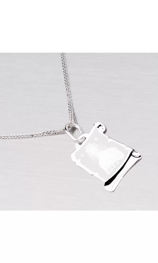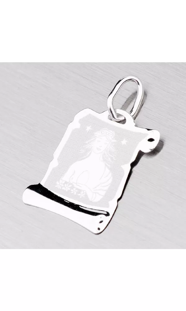 Prívesok v tvare pergamenu s hviezdnym znamením - Panna je vyrobený z bieleho štrnáctikarátového zlata - 585/1000 v kombinácii lesklej a matnej povrchovej úpravy. Tento prívesok je možné doplniť rytinou na zadnej strane podľa vášho výberu. s max. priemerom 2,00 mm