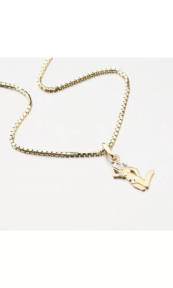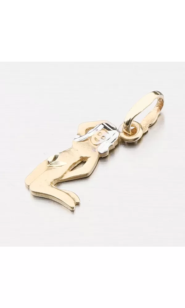 Prívesok v znamení Panna vyrobený zo štrnásťkarátového zlata v kombinácii žltej a bielej farby. Povrchová úprava je v kombinácii lesku a matu.