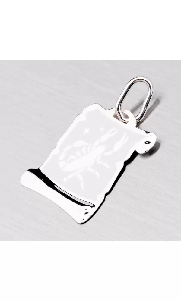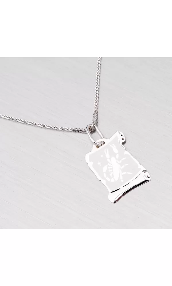 Prívesok v tvare pergamenu s hviezdnym znamením - Škorpión je vyrobený z bieleho štrnásťkarátového zlata - 585/1000 v kombinácii lesklej a matnej povrchovej úpravy. Tento prívesok je možné doplniť rytinou na zadnej strane podľa vášho výberu. K tomuto prívesku je možné použiť retiazku s max. priemerom 2,00 mm