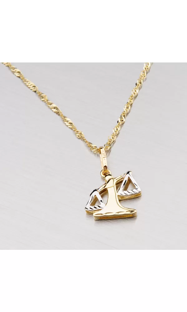 Prívesok v znamení Váh vyrobený v kombinácii žltého a bieleho štrnásťkarátového zlata 585/1000 v lesklej povrchovej úprave. Na doplňujúcej fotografii je prívesok zavesený na retiazke lambáda 304-0002.