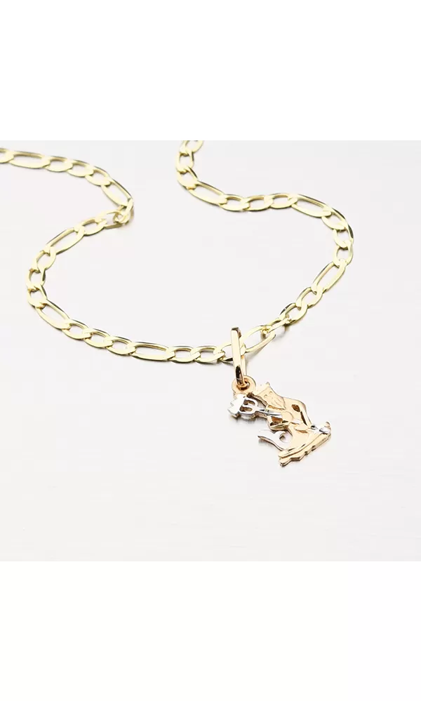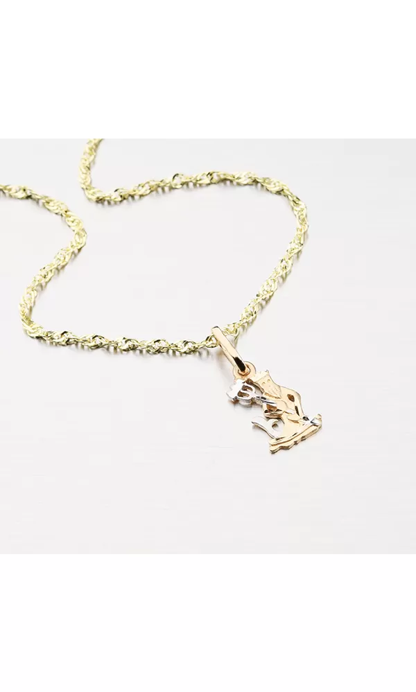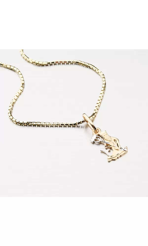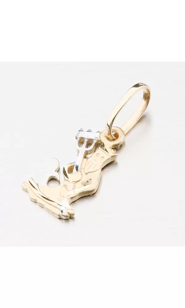 Prívesok v znamení Vodnára vyrobený zo štrnásťkarátového zlata v kombinácii žltej a bielej farby. Povrchová úprava je v kombinácii lesku a matu.