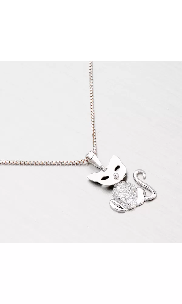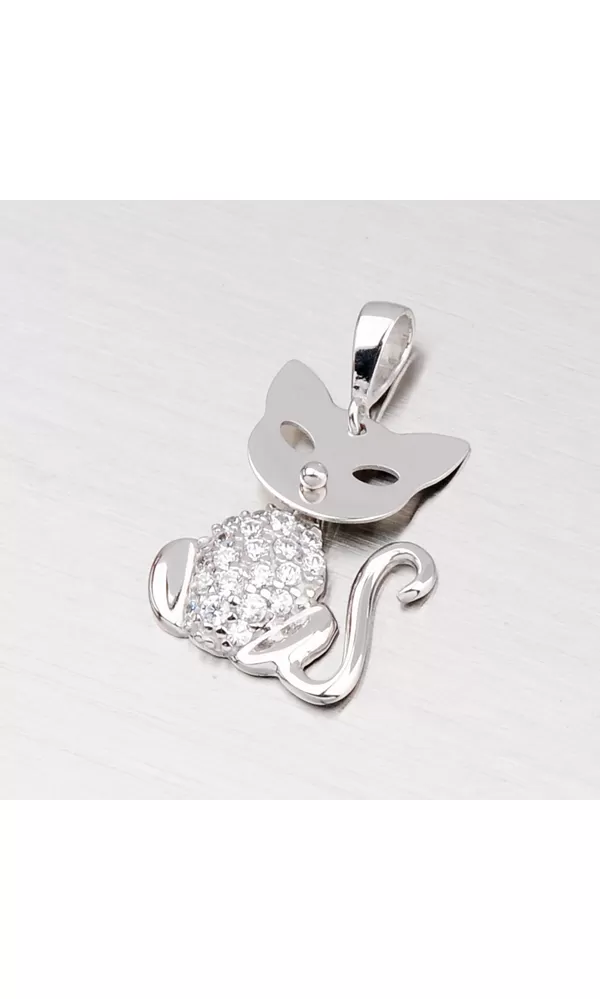 Módny prívesok z bieleho štrnásťkarátového zlata 585/000 v tvare mačky. Prívesok je v lesklej povrchovej úprave zdobený trblietavými zirkónmi na brušku mačky. Zirkóny majú priemer 1mm.