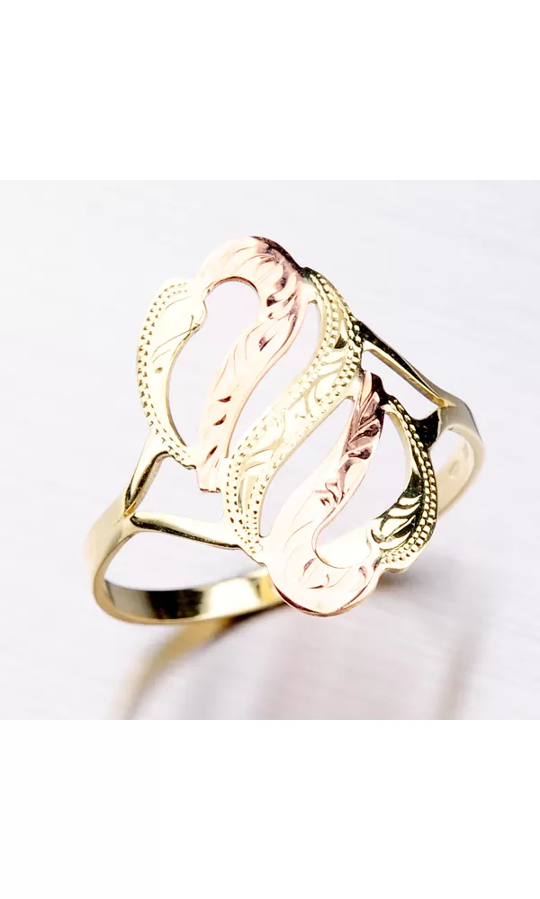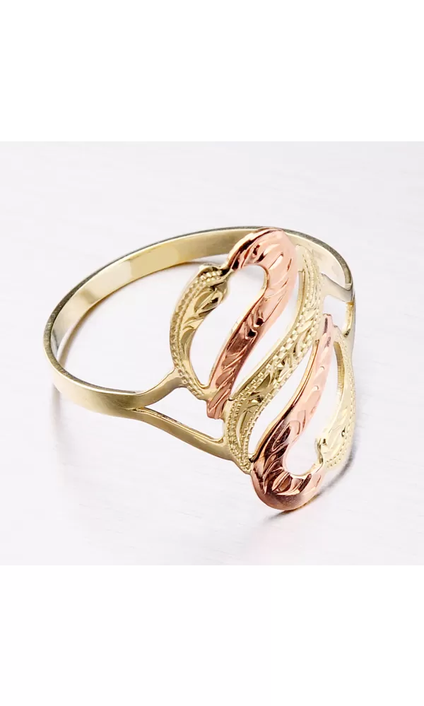 Väčší dámsky prsteň je vyrobený tradičnou klenotníckou technikou v kombinácii žltého a červeného štrnásťkarátového zlata 585/1000. Prsteň je vyrobený v kombinácii lesklej a matnej povrchovej úpravy a je bohato zdobený ručným rytím.