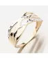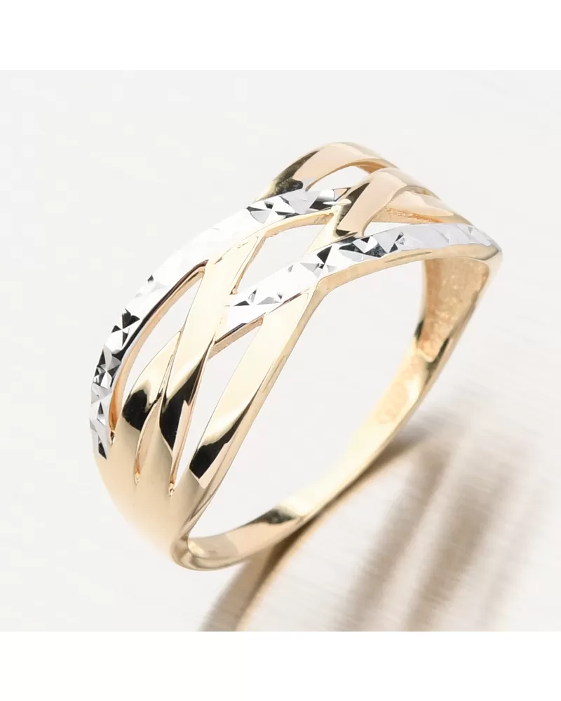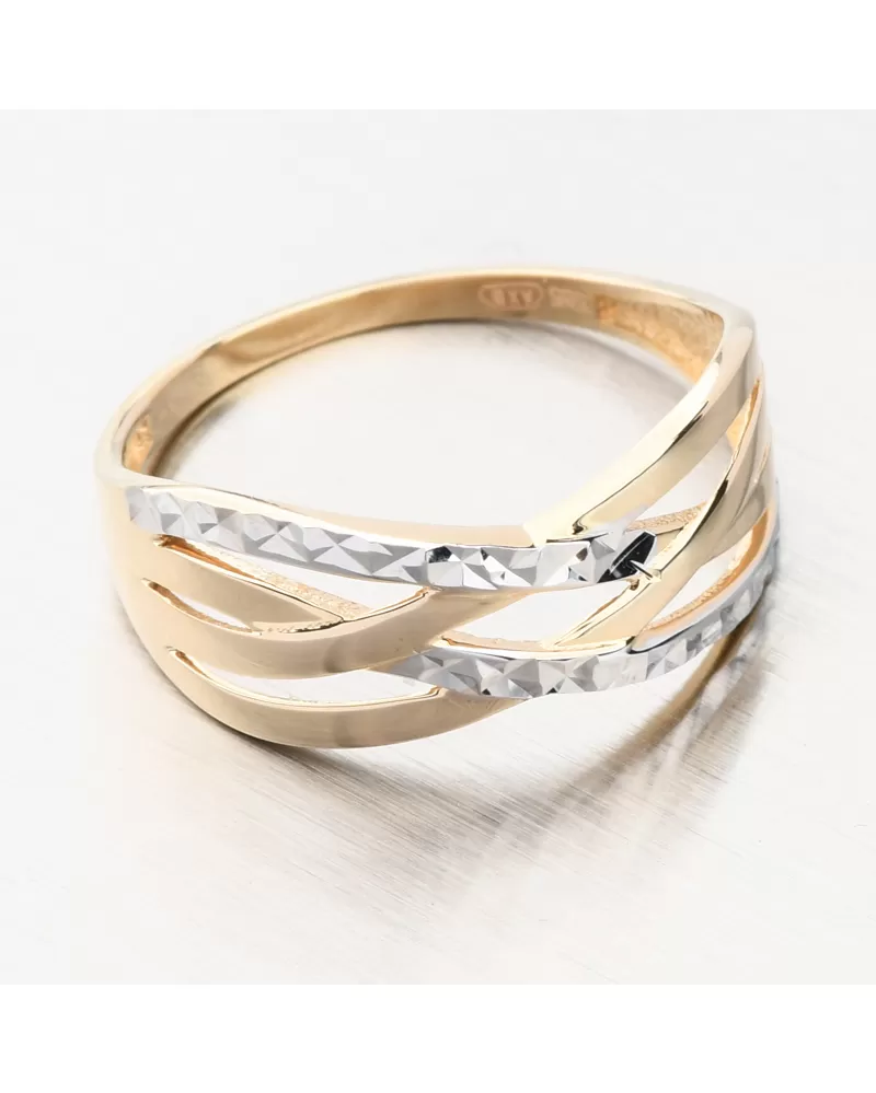 Velmi zajímavý a precizně zpracovaný zlatý dámský prsten. Prsten je složen z jednotlivých propletených linií, které se od sebe liší barvou zlata a povrchovou úpravou - gravírováním. Dvě linie jsou v bílé barvě zlata a je zvýrazněné gravírováním. Gravírování je za pomocí diamantového hrotu a dodávají šperku maximální lesk a brilanci ze všech úhlů. Zbylé části a linie jsou ve žlutém zlatu ve vysokém lesku.