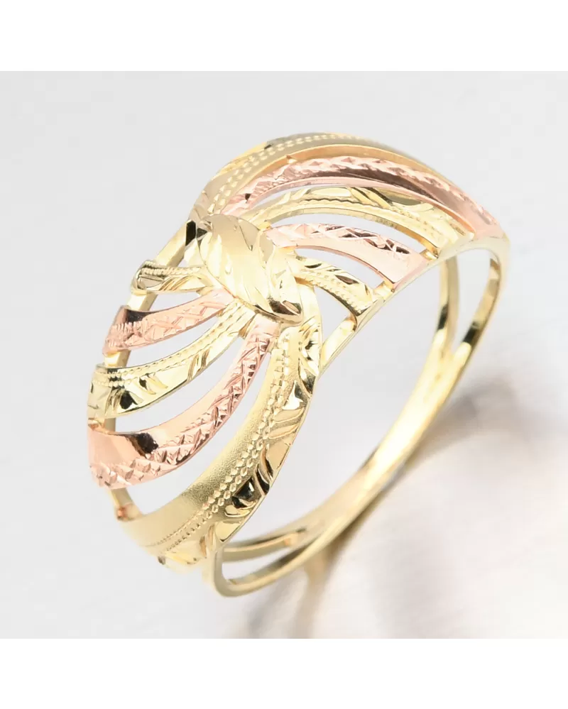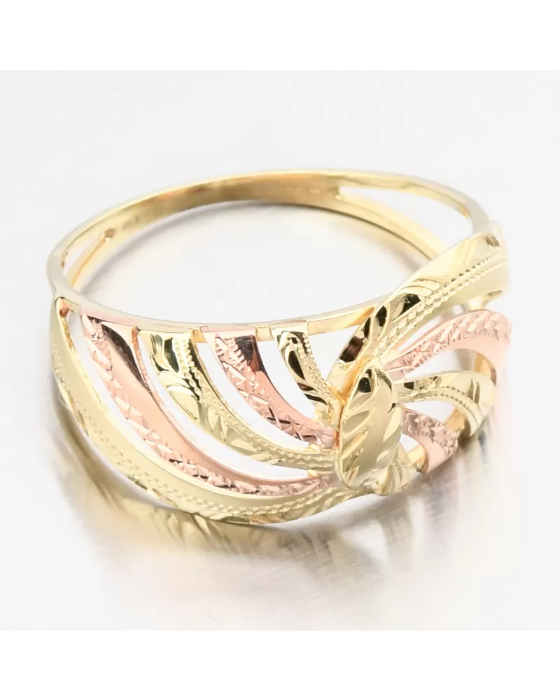 Dámsky prsteň vyrobený v kombinácii žltej a červenej štrnásť karátovej zlato 585/000 v lesklom povrchu s gravírovaním rúk.