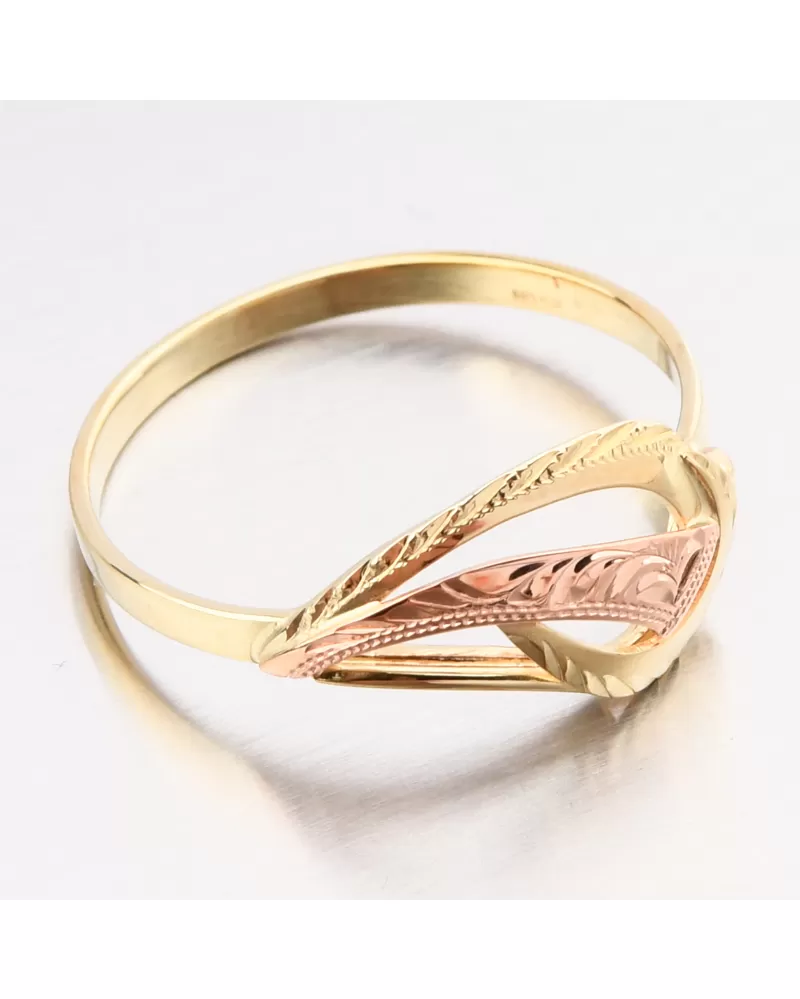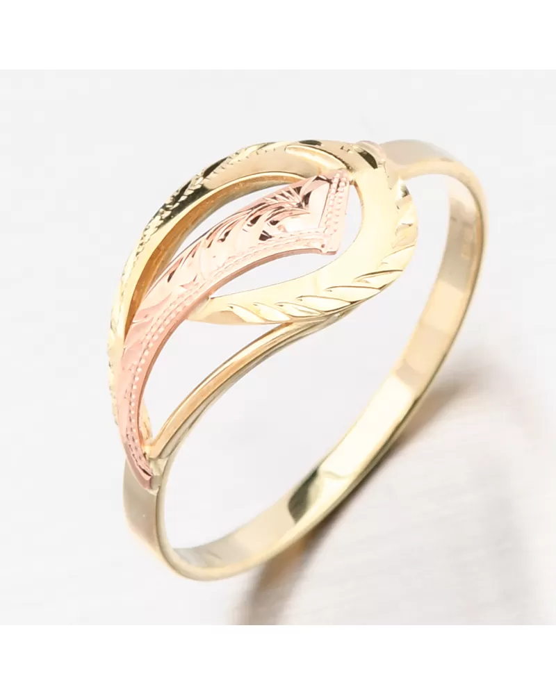 Dámsky prsteň vyrobený tradičnou technikou šperkov v kombinácii žltého a červeného štrnástich zlatých zlata 585/1000. Prsteň je vyrobený v lesklom povrchu a je bohato zdobený ručným gravírovaním.