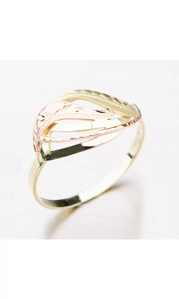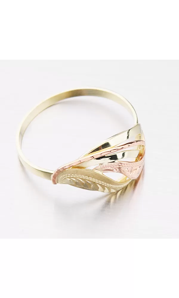 Dámsky prsteň je vyrobený tradičnou klenotníckou technikou v kombinácii žltého a červeného štrnáctikarátového zlata 585/1000. Prsteň je vyrobený v kombinácii lesklej a matnej povrchovej úpravy a je bohato zdobený ručným rytím.