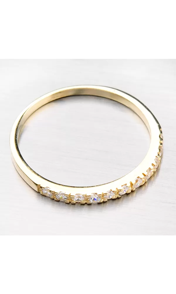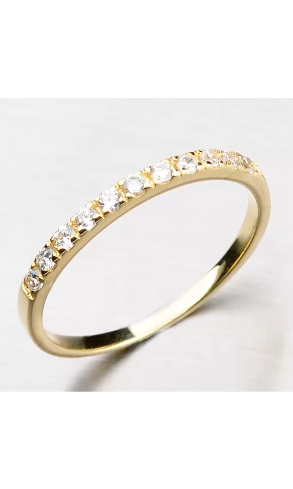 Tento krásne žiarivý dámsky prsteň vyrobený zo žltého štrnásťkarátového zlata s rýdzosťou 585/1000 v lesklej povrchovej úprave zaujme jedenástimi zirkónmi v briliantovom bruse vsadenými do jedného radu na obrúčku.