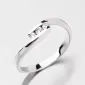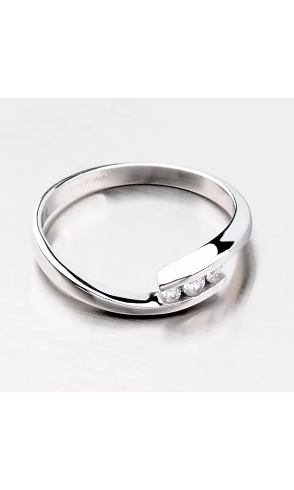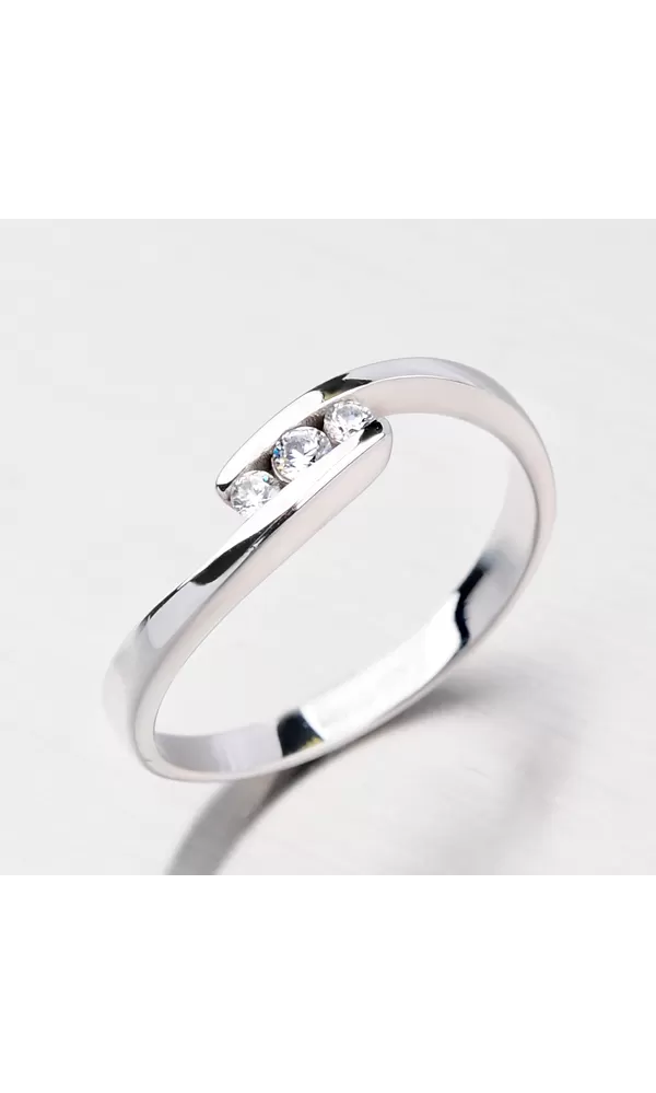 Decentný dámsky prsteň vyrobený zo štrnástich karátového bieleho zlata s rýdzosťou 585/1000 v lesklej povrchovej úprave s jedným väčším a dvoma menšími bielymi zirkónmi. Prsteň sa bude krásne vynímať na vašej ruke a zaujme vaše okolie.