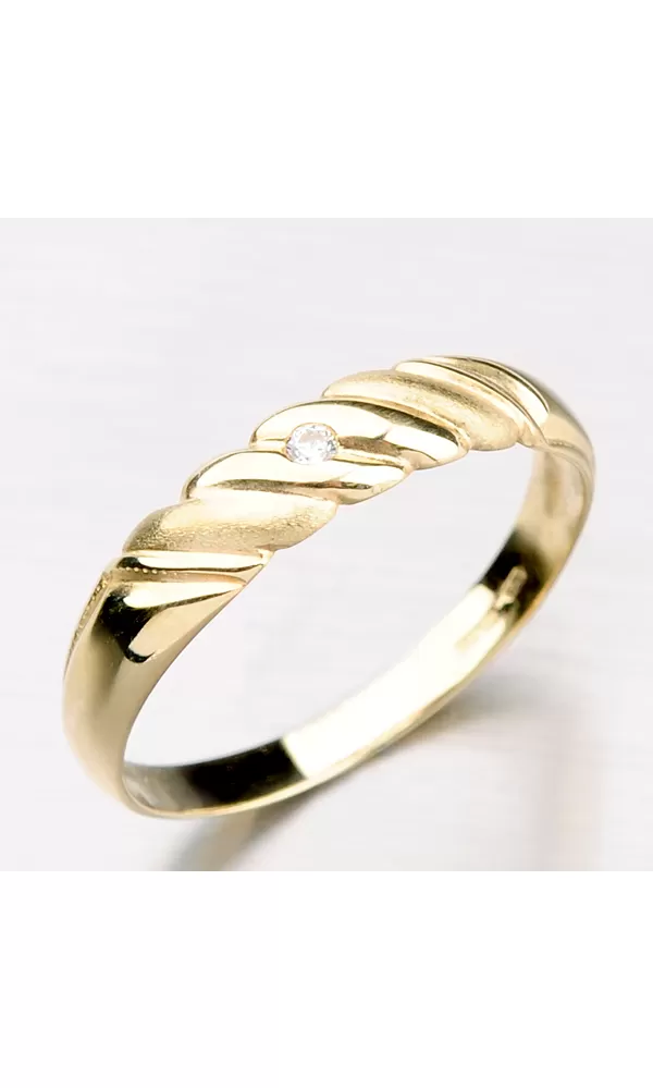 Jednoduchý, ale zaujímavý prsteň ako je tento urobí radosť každej žene, ktorej bude darovaný. Prsteň je vyrobený zo žltého štrnásťkarátového zlata s rýdzosťou 585/1000 v kombinácii lesklého a matného povrchu s jedným zirkónom uprostred.