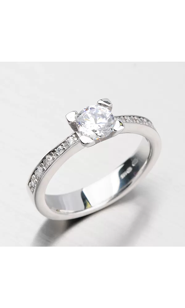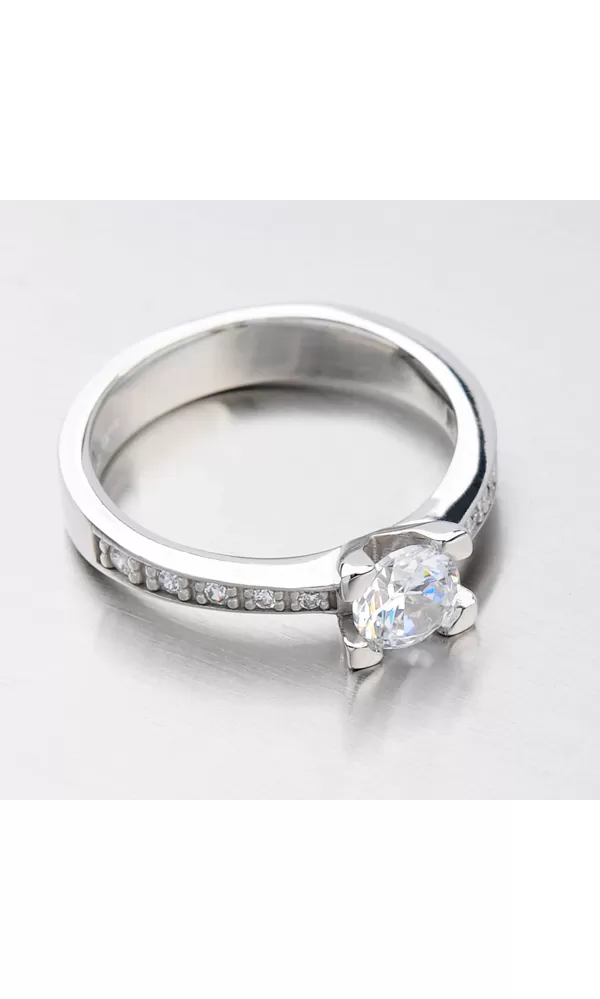 Luxusný dámsky prsteň vyrobený zo štrnástich karátového bieleho zlata s rýdzosťou 585/1000 v lesklej povrchovej úprave s desiatimi menšími a jedným väčším bielym zirkónom. Prsteň rozhodne zaujme vás aj vaše okolie a vy ho nebudete chcieť zložiť z ruky.