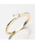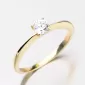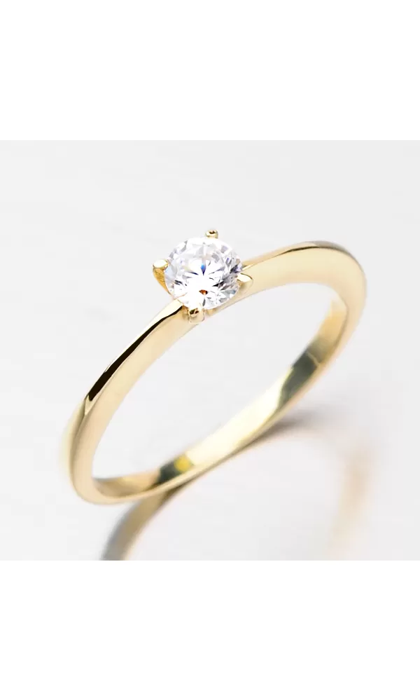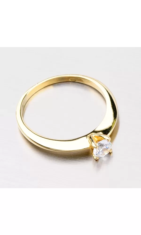 Dámsky prsteň zhotovený zo žltého štrnástich karátového zlata s rýdzosťou 585/1000 v lesklej povrchovej úprave. Prsteň má štvor-krabovú korunku vo vnútri ktorej je vsadený žiarivý zirkón bielej farby. Prsteň pôsobí decentným, ale elegantným štýlom.