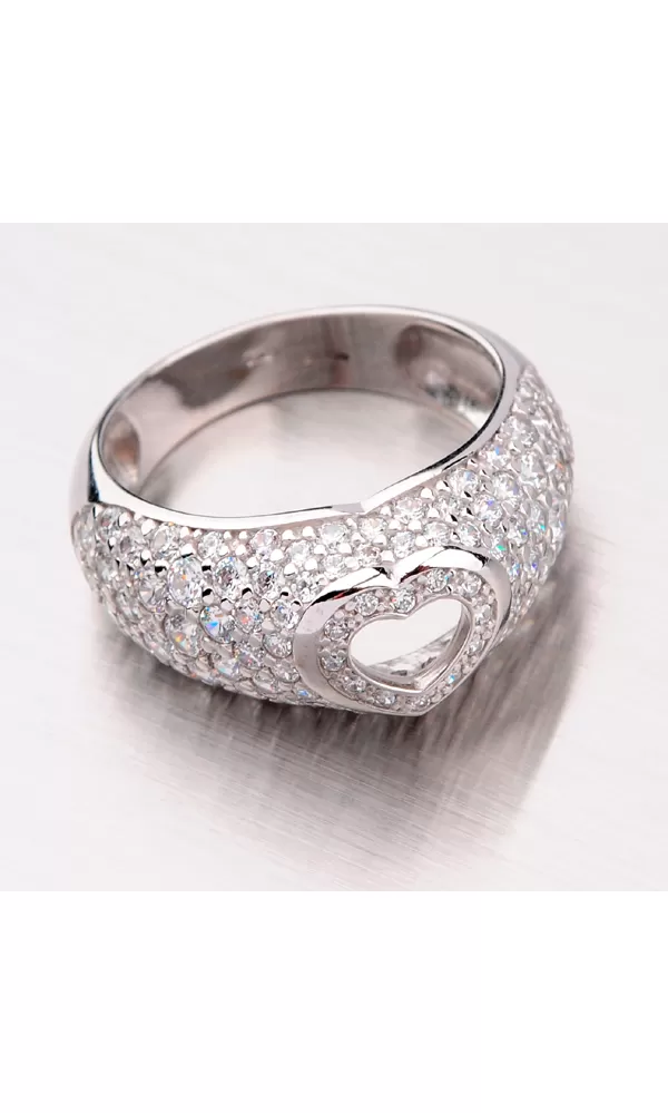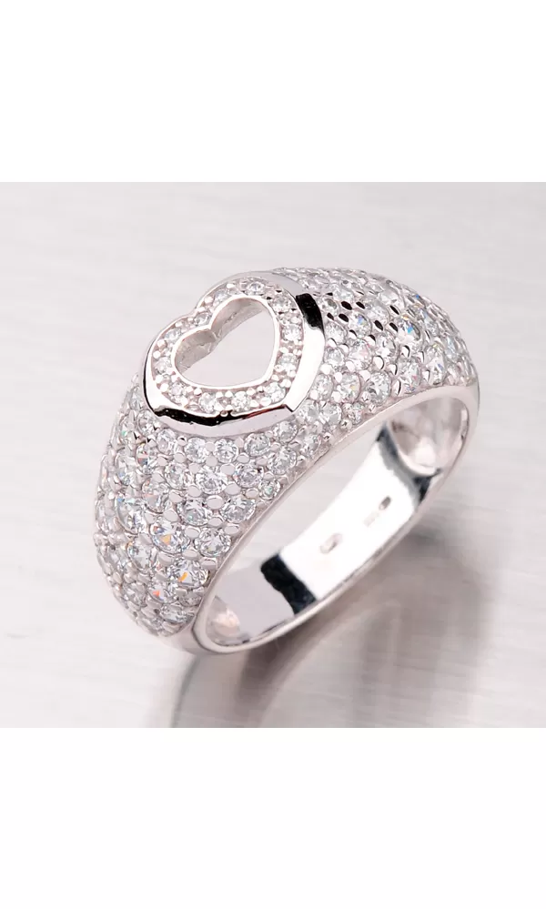 Exkluzívny dámsky prsteň je vyrobený z bieleho štrnásťkarátového zlata 585/1000 v lesklej povrchovej úprave. Prsteň je posádzaný drobnými bielymi zirkónmi a uprostred je vyrezané nádherné srdce, ktoré dodáva prsteňa na jedinečnosti.