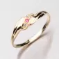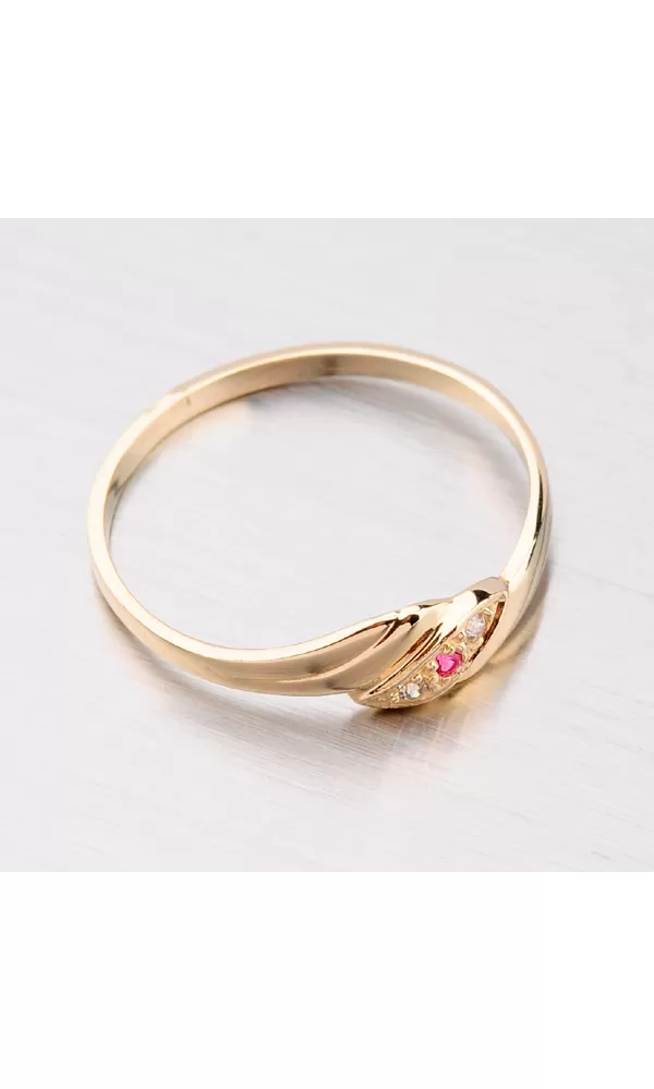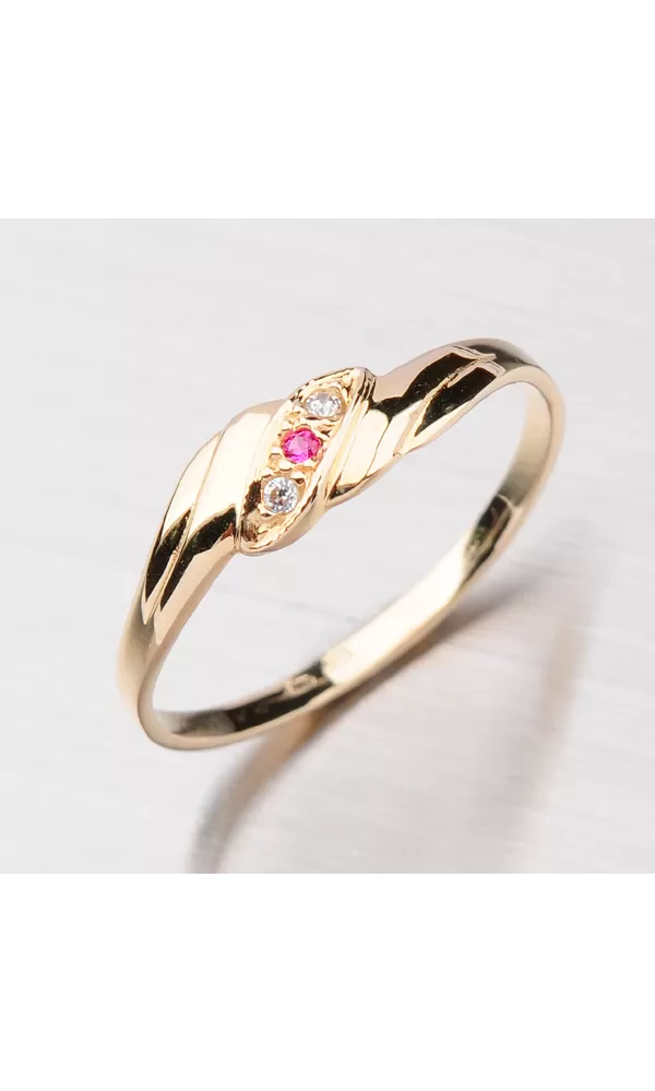 Klasický ženský prsteň je vyrobený zo žltých štrnástich -karátových zlatých 585/1000 v lesklom povrchu. Prsteň je zdobený dvoma bielymi zirkónmi a jednou červenou farbou.