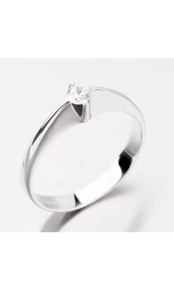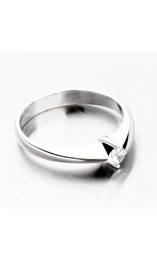 Elegantný dámsky prsteň vyrobený zo štrnástich karátového bieleho zlata o rýdzosti 585/1000 vás zaujme netradičným vzhľadom obrúčky, ktorá sa mení v korunku vo vnútri ktorej je vsadený žiarivý zirkón v bielej farbe. Prsteň je vyrobený v lesklej povrchovej úprave a zaručene očarí vás aj vaše okolie.
