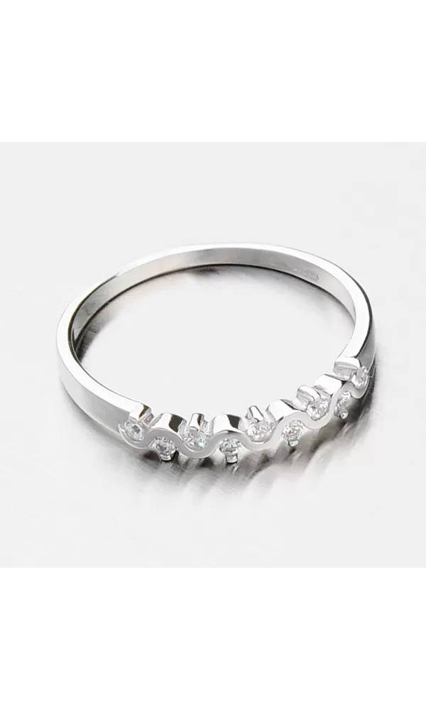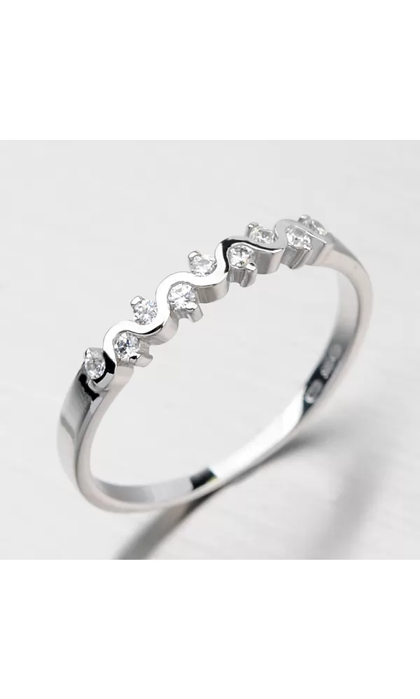 Nádherný prsteň vyrobený z bieleho štrnástich karátového zlata s rýdzosťou 585/1000 si zamilujete vďaka svojmu decentnému vzhľadu. Drobné zirkóny sú vsadené na preskáčku vedľa obrúčky, ktorá sa zámerne vlní a vytvára tak krásny efekt. Prsteň je vyrobený s lesklou povrchovou úpravou a hodí sa ako decentné doplnenie vášho šarmu.