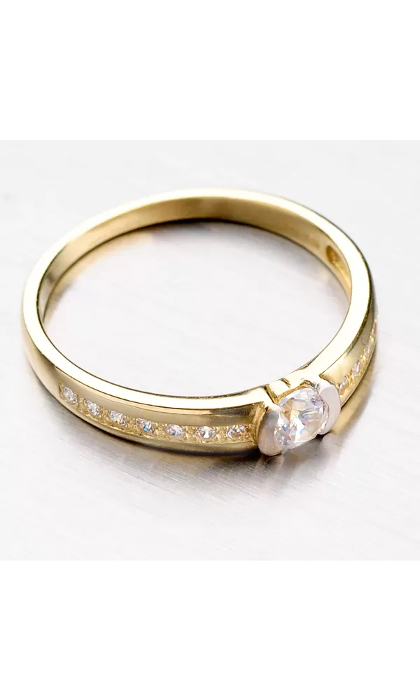 Tento krásny dámsky prsteň vyrobený zo žltého štrnástich karátového zlata s rýdzosťou 585/1000 v lesklej povrchovej úprave zaujme svojim symetrickým tvarom a krásnymi zirkónmi vybrúsenými do briliantového tvaru.