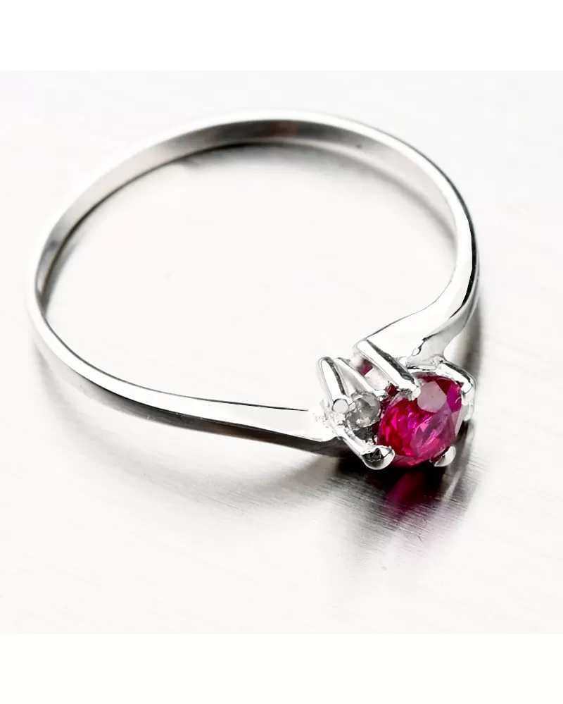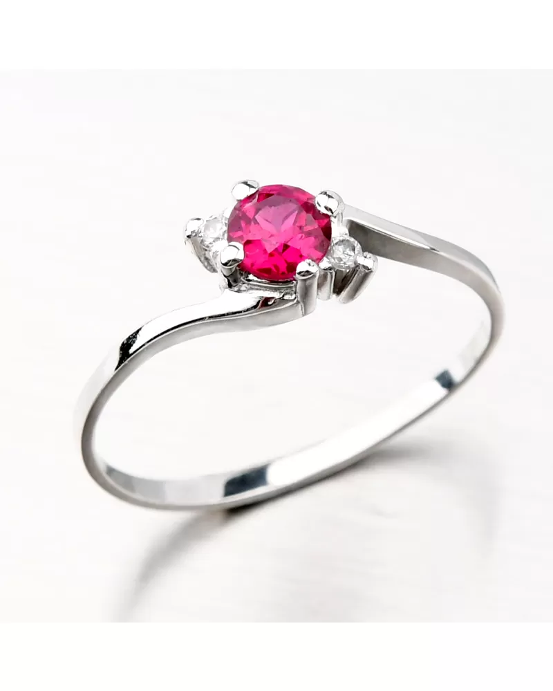 Jemný dámsky prsteň so zirkónmi vyrobený z bieleho štrnásťkarátového zlata 585/1000 v lesklej povrchovej úprave. Prsteň je zdobený červeným zirkónom, ktorý je v centre prsteňa a okolo neho je potom z každej strany biely zirkón. a dodáva prsteňa nevšedný dizajn.