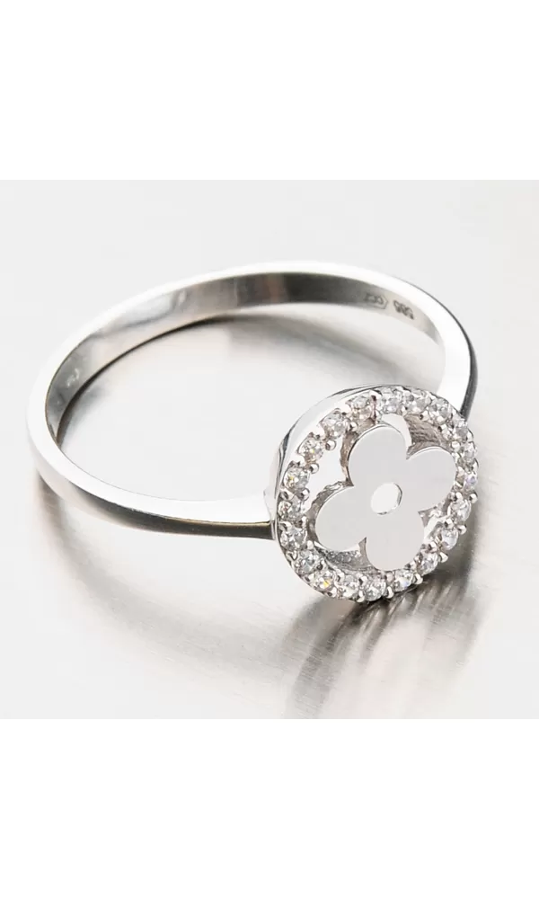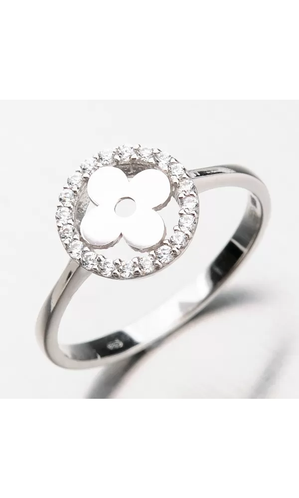 Tento prsteň zdobí krúžok, ktorý je vysadený zirkónmi v briliantovom bruse. V krúžku je umiestnený štvorlístok v lesklej povrchovej úprave. Prsteň je vyrobený z bieleho štrnásťkarátového zlata - 585/1000 v lesklej povrchovej úprave.