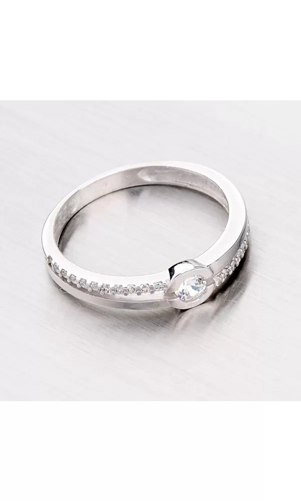 Krásny prsteň vyrobený z bieleho štrnásťkarátového zlata 585/1000 v lesklej povrchovej úprave ozdobí Vašu ruku dokonale. Prsteň je rozjasnený hlavným zirkónom, ktorý je vsadený do prsteňa tak, aby bol prsteň nielen krásny ale aj praktický. Okolo hlavného zirkónu sú vsadené menšie zirkóny. Prsteň je jednoduchý a elegantný takže sa skvele dá skombinovať aj s inými šperkami.