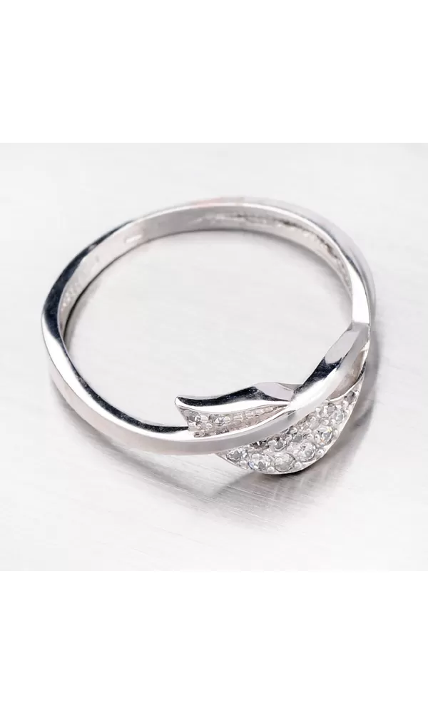 Tento jednoduchý ale napriek tomu elegantný prsteň má tvar lístka, cez ktorý sa z jednej obrúčky line tenká vlnka. Lístok je vysadený bielymi zirkónmi, ktoré rozžiaria váš vzhľad. Prsteň je vyrobený z bieleho štrnástich karátového zlata o rýdzosti 585/1000.