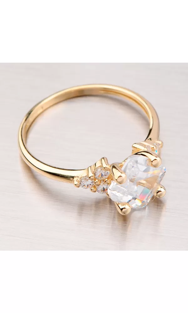 Krásny dámsky prsteň s bielymi zirkónmi po stranách a jedným veľkým hranatým bielym zirkónom uprostred je vyrobený zo žltého štrnástich karátového zlata 585/1000. Prsteň je vyrobený v lesklej povrchovej úprave.