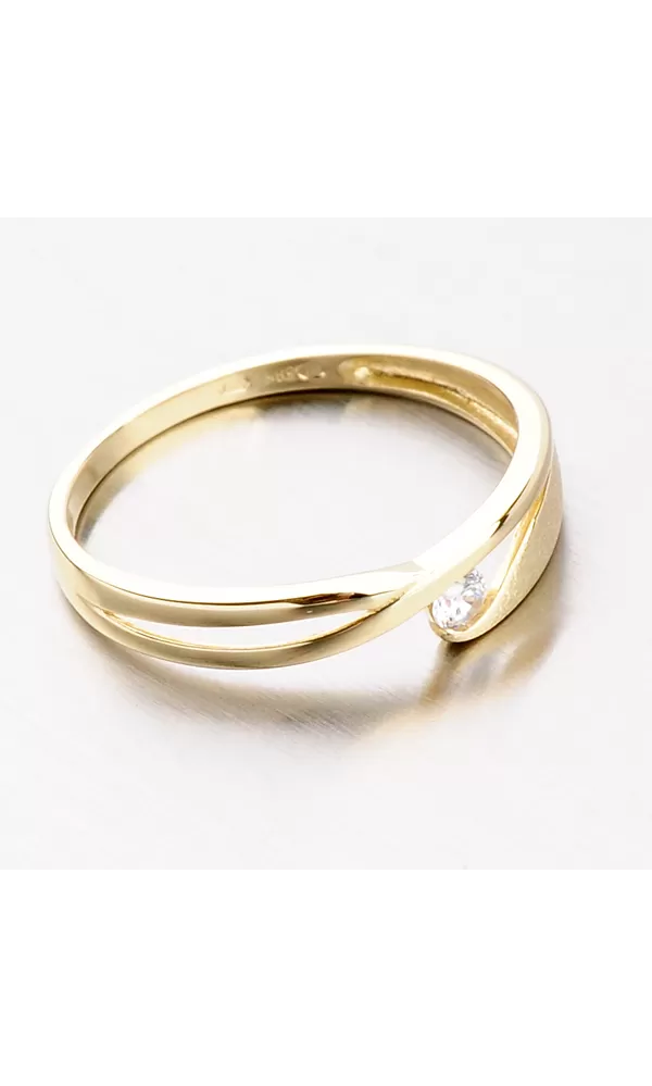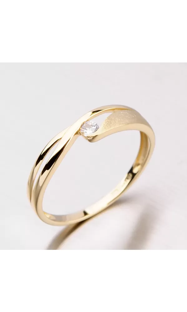 Dámsky prsteň s jedným bielym zirkónom je vyrobený zo žltého štrnástich karátových zlatých s čistotou 585/1000. Prsteň je vyrobený v kombinácii lesklého a matného povrchu.
